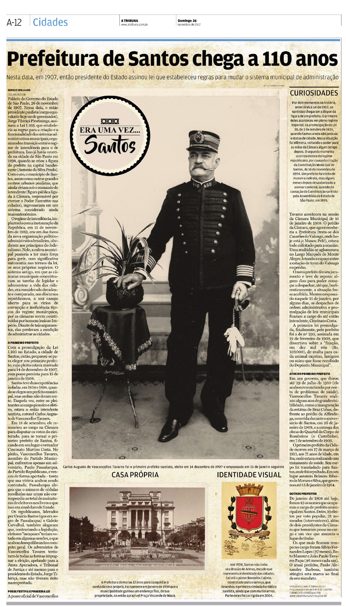 EDIÇÃO DE 26 de noveMBRO DE 2017Sergio Willians conta como foi a criação da Prefeitura Municipal de Santos e fala do seu primeiro prefeito, o Coronel Vasconcelos Tavares. |
