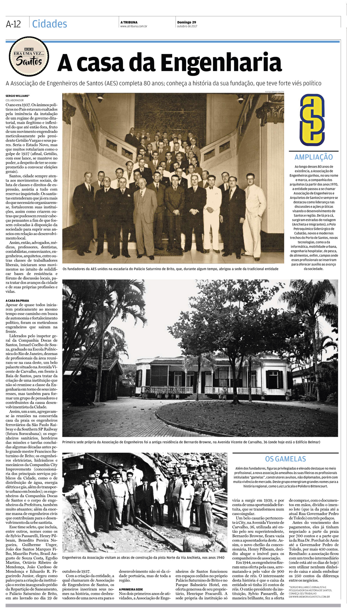 EDIÇÃO DE 26 de novembro DE 2017O jornalista Sergio Willians conta como foi a criação da Associação de Engenheiros e Arquitetos de Santos, ocorrida em 26 de novembro de 1937, traçando os primeiros momentos históricos desta importante entidade classista. |