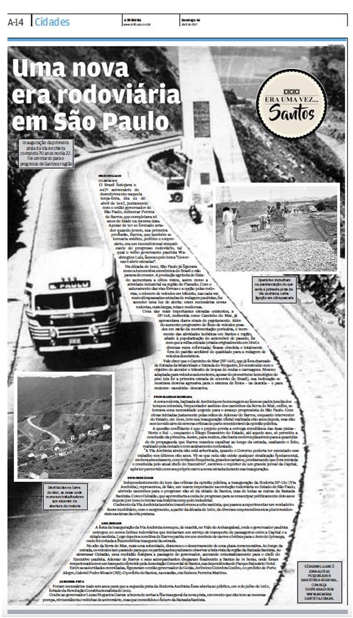EDIÇÃO DE 16 de abril DE 2017Sergio Willians fala sobre a inauguração da Pista Norte da Rodovia Anchieta (SP-150). O fato, ocorrido em 22 de abril de 1947, determinou uma nova era no setor de transportes e contribuiu para a transformação da região da Baixada Santista. |