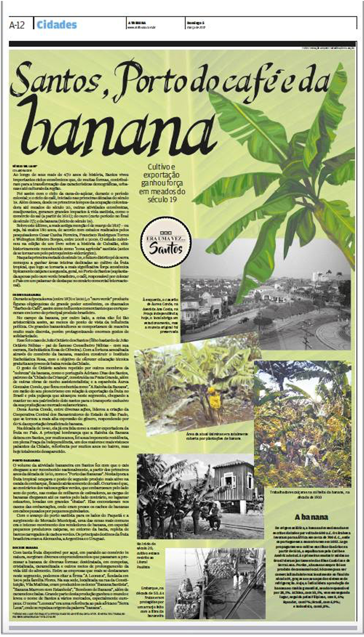 EDIÇÃO DE 5 de março DE 2017Neste artigo é apresentado um resumo do impacto econômico da produção de banana na Baixada Santista, cuja primeira referência documental data de março de 1837 (180 anos). Ao longo do texto, cito os maiores produtores e exportadores, como João Octávio (idealizador do Instituto Escolástica Rosa) e Dona Áurea Conde, a Rainha da Banana, cujo palacete fez fama na Praça da Independência. Também falo sobre a antiga fábrica de doces de banana, A Leonesa. |