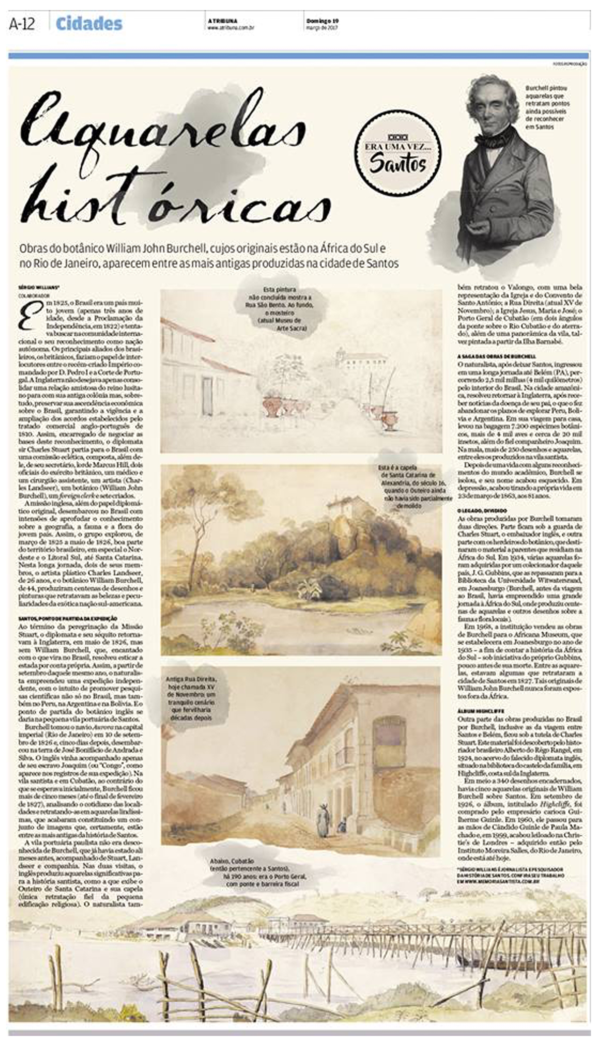 EDIÇÃO DE 19 de março DE 2017Sergio Willians discorre sobre a passagem, entre 1826 e 1827, do naturalista e botânico inglês William John Burchell que, aqui, produziu algumas belíssimas aquarelas, revelando uma vila de Santos com seus ares coloniais. |