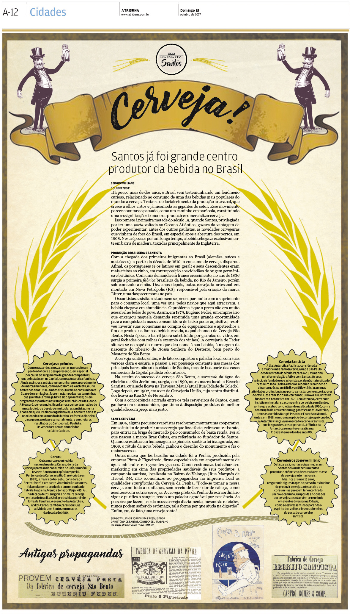 EDIÇÃO DE 15 de OUTUBRO DE 2017Você sabia que a cidade de Santos foi um grande centro cervejeiro no país? Essa foi a história contada pelo jornalista Sergio Willians na ediçao de 15 de outubro. Muita gente ficou com vontade de sorver mais deste conhecimento! |