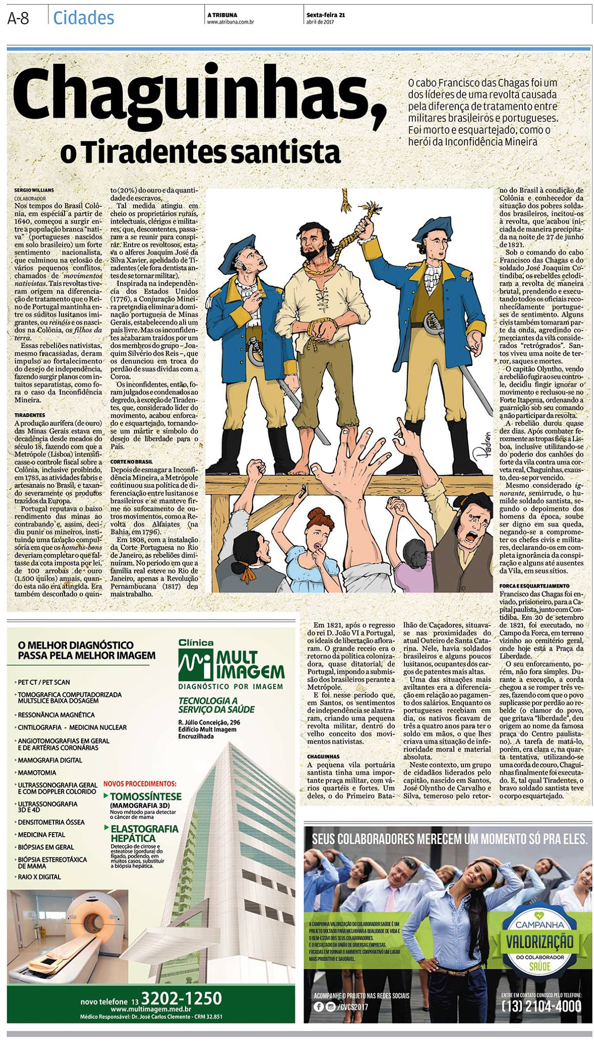 EDIÇÃO ESPECIAL DE 22 DE ABRIL DE 2017Sergio Willians fala sobre os conflitos de naturezas nativistas e até separatistas que ocorriam no Brasil Colônia, entre eles a famosa Inconfidência Mineira, de onde emergiu o herói Joaquim José da Silva Xavier, o “Tiradentes”, e traçou um paralelo à história do soldado santista Francisco das Chagas, o Chaguinhas, protagonista de uma grande rebelião ocorrida na vila de Santos em 1821, provocada justamente em meio às ideias de Independência que já rondavam o país e que se concretizaram no ano seguinte, no 7 de setembro. |