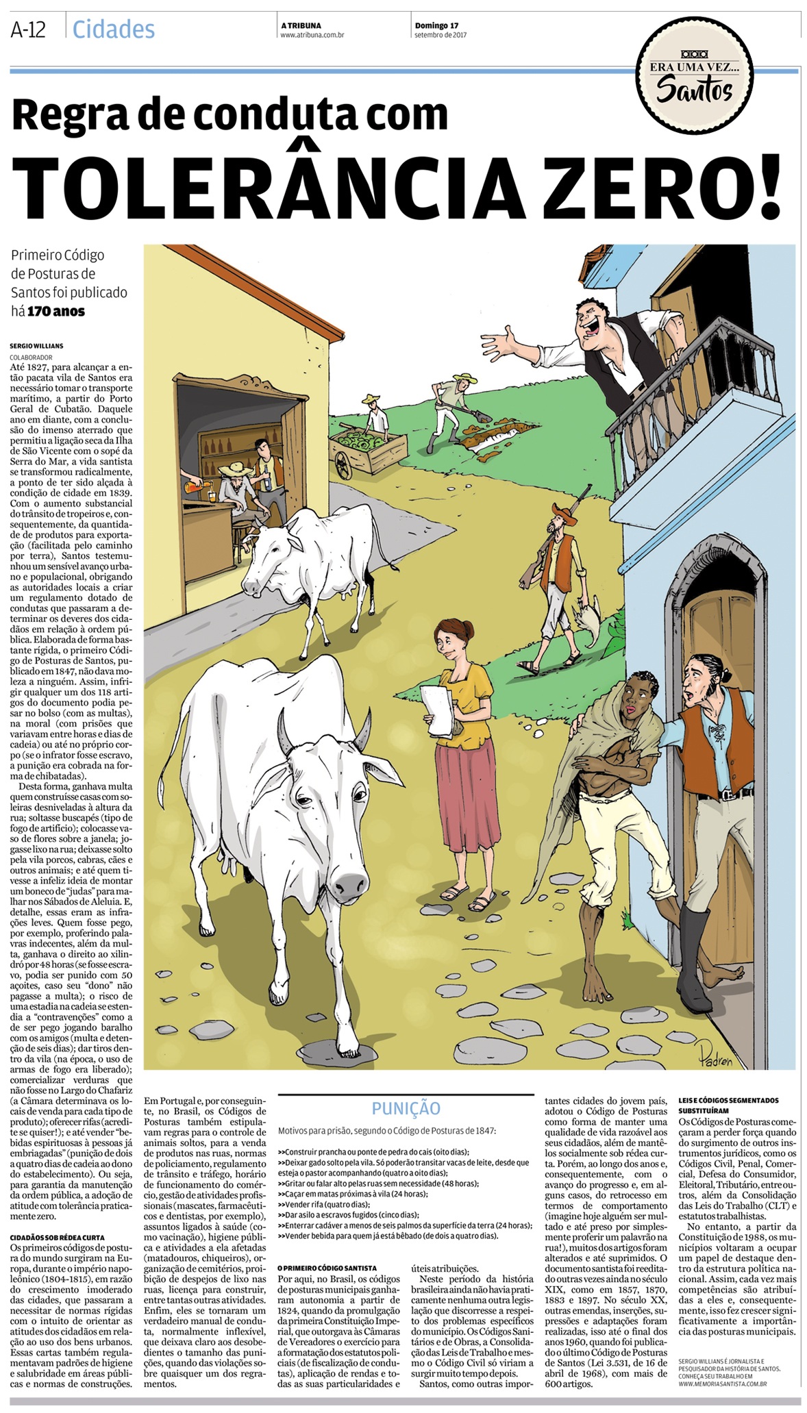 EDIÇÃO DE 17 de SETEMBRO DE 2017Sergio Willians conta num texto divertido, como era o Primeiro Código de Posturas da cidade de Santos, promulgado em 1847. |