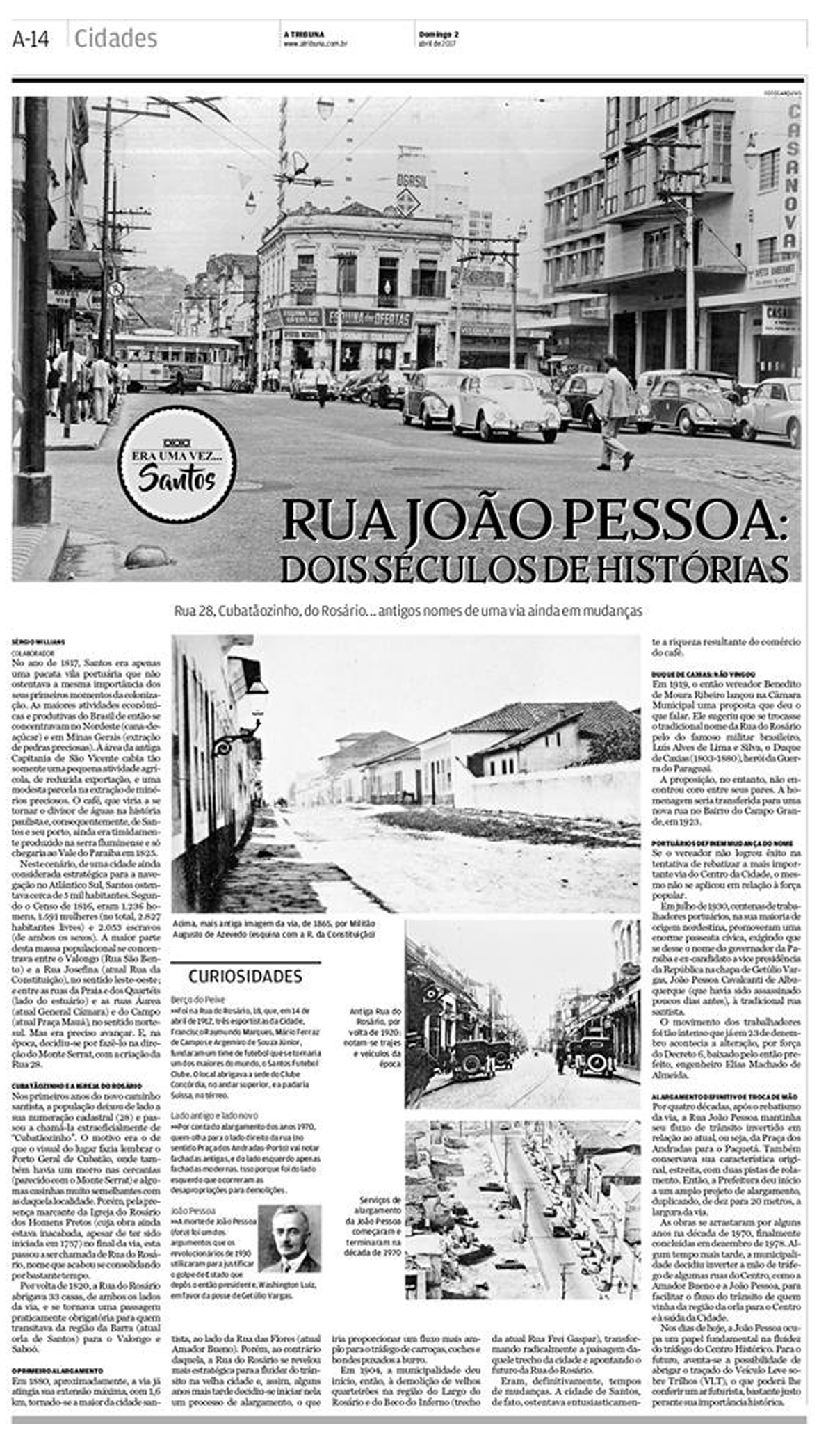 EDIÇÃO DE 2 de abril DE 2017Sergio Willians aborda os 200 anos da abertura da atual Rua João Pessoa (este nome só foi oficialmente inserido em 1930). Conheça todas as histórias desta importante via. |