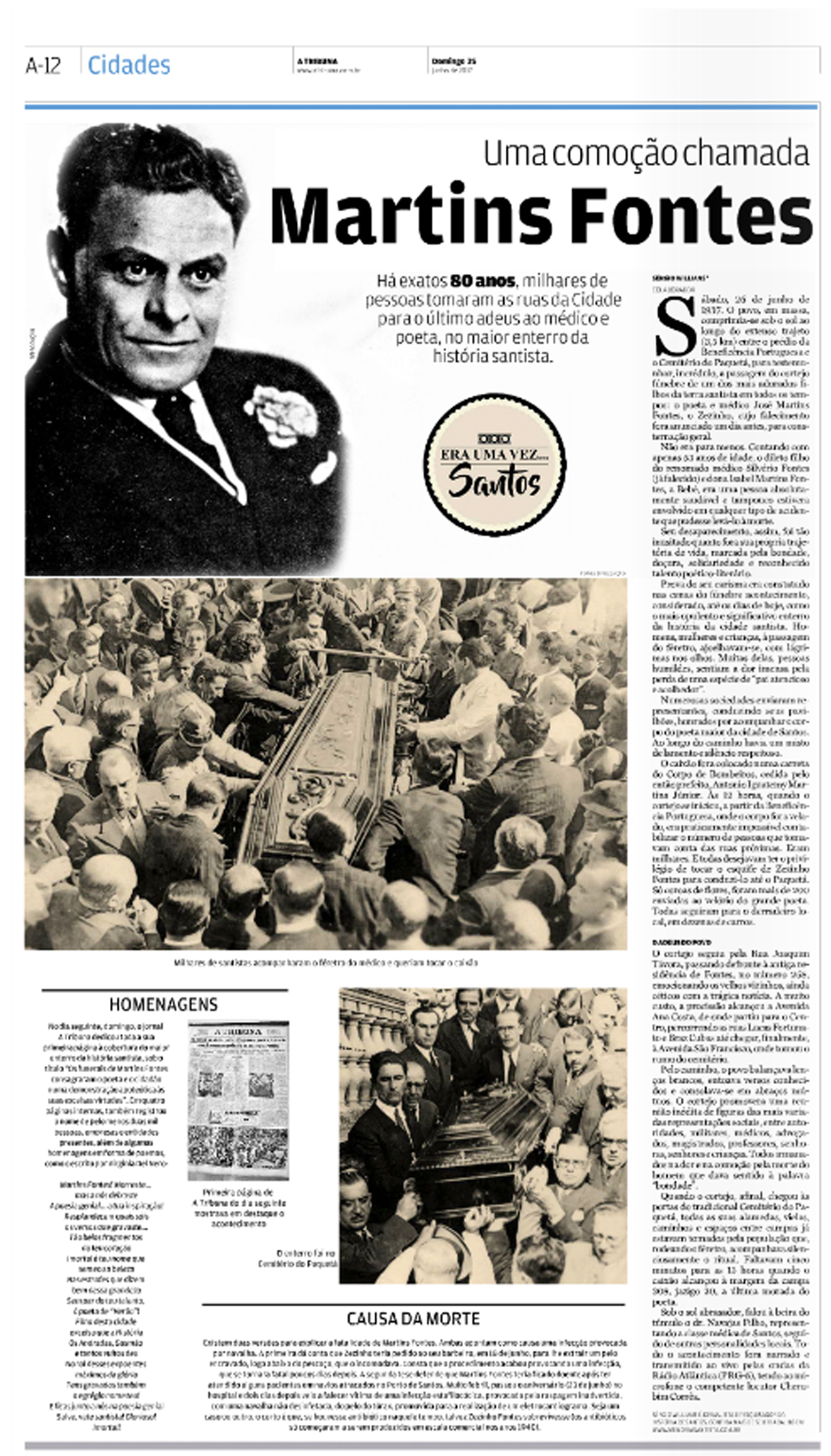 EDIÇÃO DE 25 de junho DE 2017Sergio Willians escreve sobre o dia em que a cidade de Santos parou para chorar a morte de um de seus maiores filhos: o grande poeta e médico José Martins Fontes. |