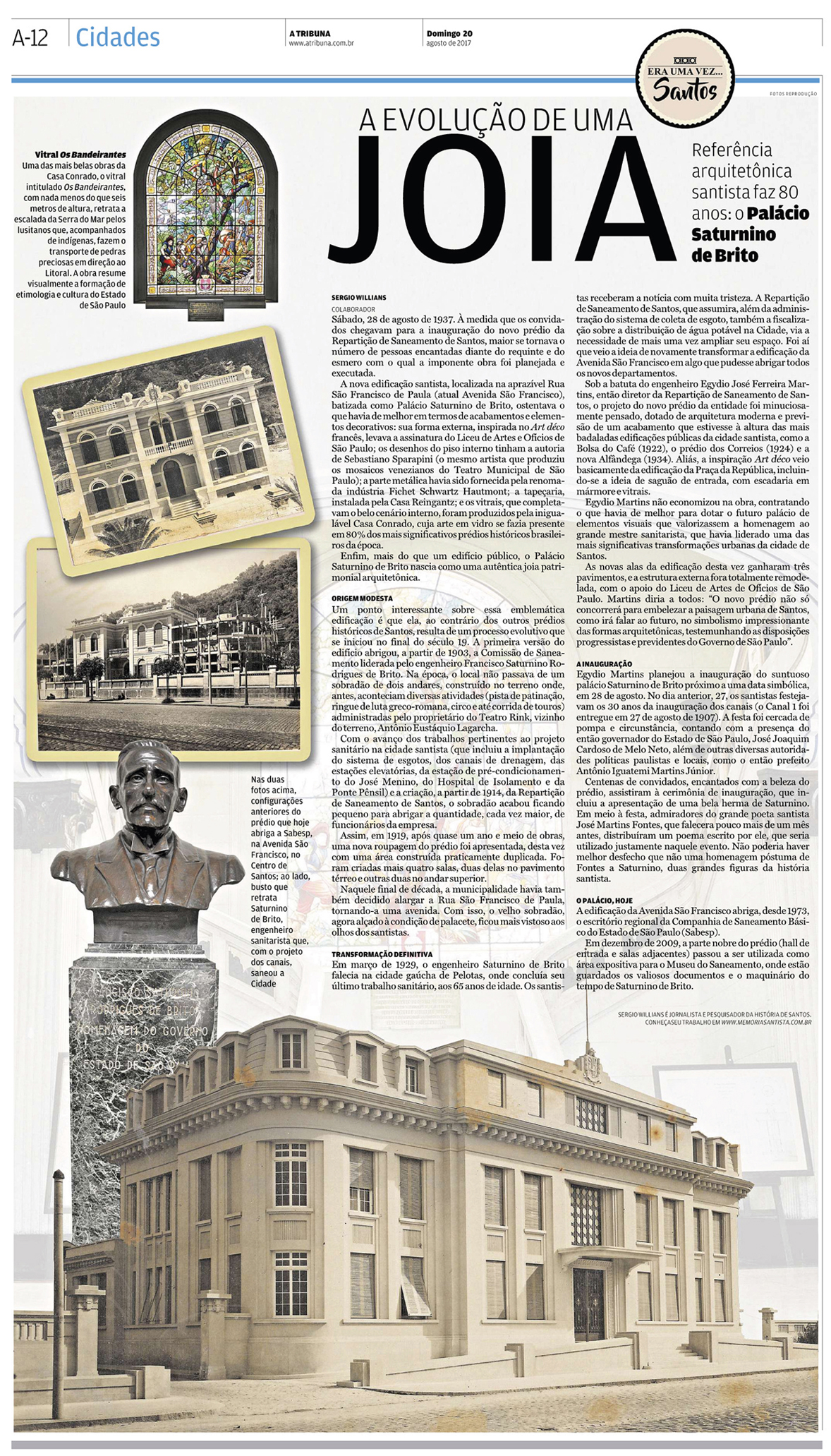 EDIÇÃO DE 20 de agosto DE 2017Sergio Willians conta a história do Palácio Saturnino de Brito, uma das mais belas edificações art déco de Santos, que completou 80 anos de existência. |