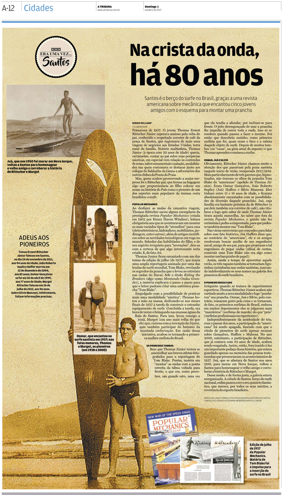 EDIÇÃO DE 01 de OUTUBRO DE 2017Nesta edição, o jornalista Sergio Willians narra a polêmica história da origem do surfe no Brasil, em 1938, e seus personagens, como Thomas e Margot Ritcher, Juhá Raffers, Osmar Gonçalves e Silvio Manzoni. |