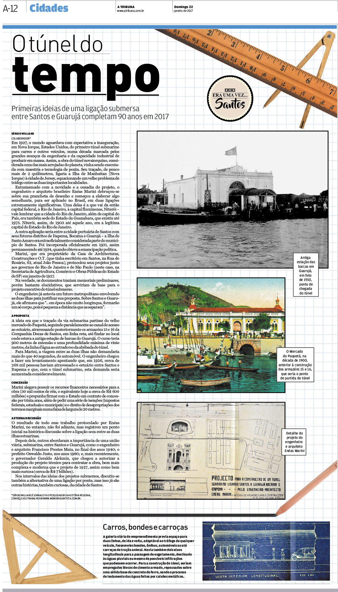 EDIÇÃO DE 22 DE JANEIRO DE 2017Sergio Willians fala sobre o primeiro projeto de túnel submarino entre Santos e Guarujá, produzido em 1927 pelo engenheiro arquiteto Enéas Marini. |
