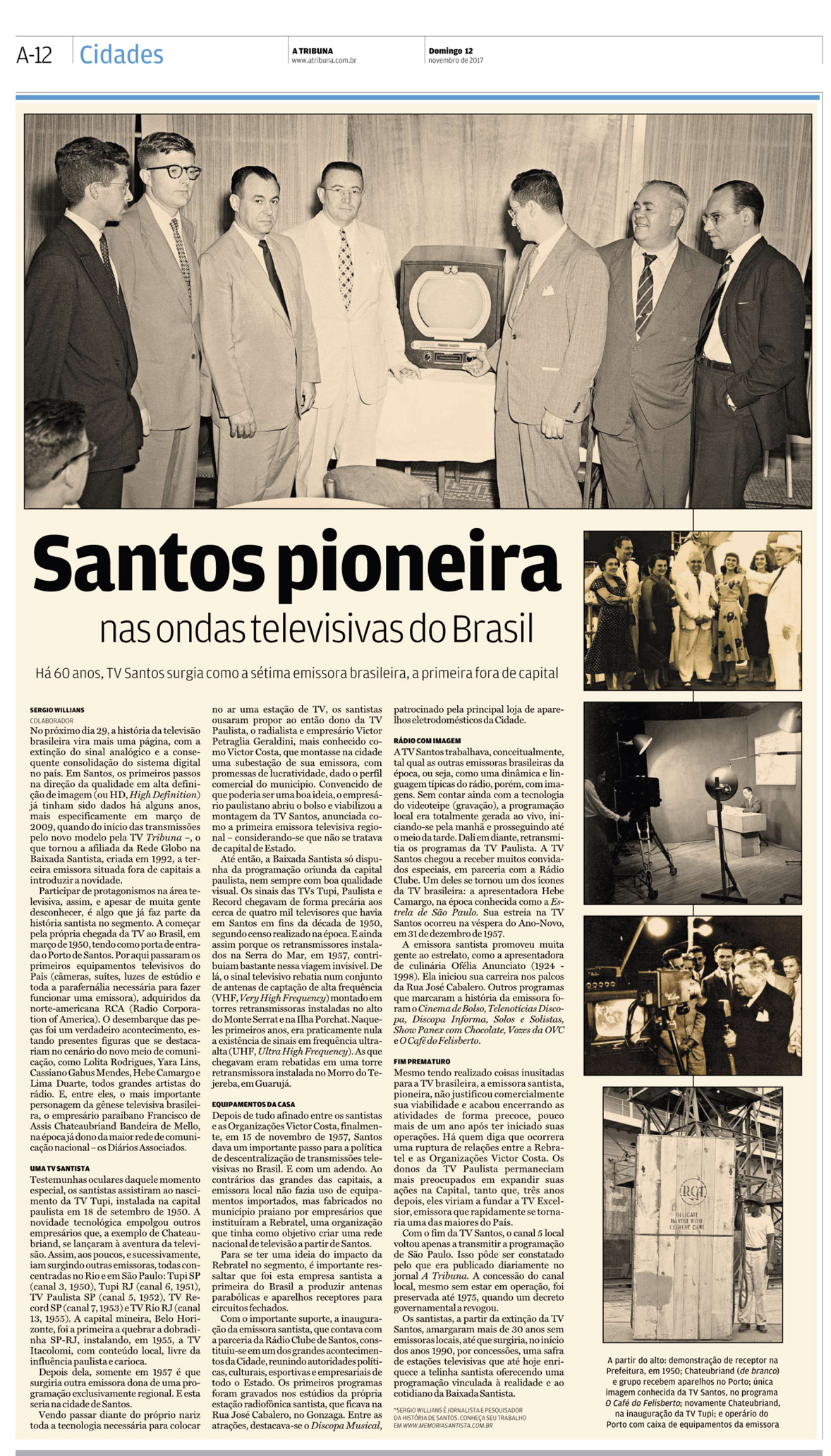 EDIÇÃO DE 12 de novembro DE 2017A cidade de Santos também teve participação pioneira na implantação da TV no Brasil. É o que o jornalista Sergio Willians conta neste interessante artigo, onde é narrada a trajetória da extinta TV Santos, a primeira emissora regional do Brasil, fundada em 1957. |