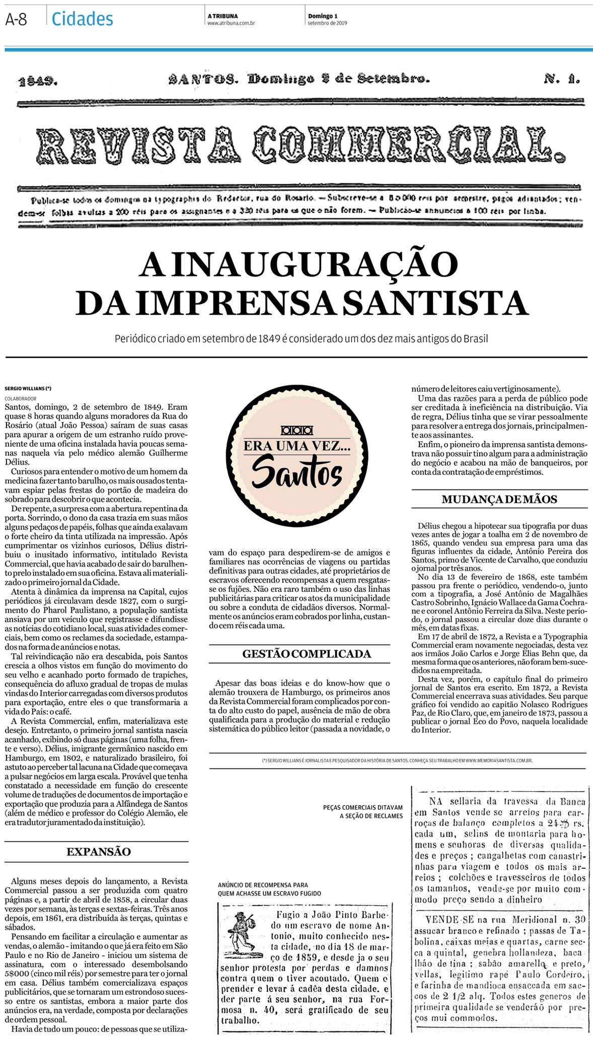EDIÇÃO DE 01 de SETEMBRO DE 2019O jornalista Sergio Willians conta um pouco sobre o primeiro periódico santista da história, a Revista Commercial, fundada em 1849. |