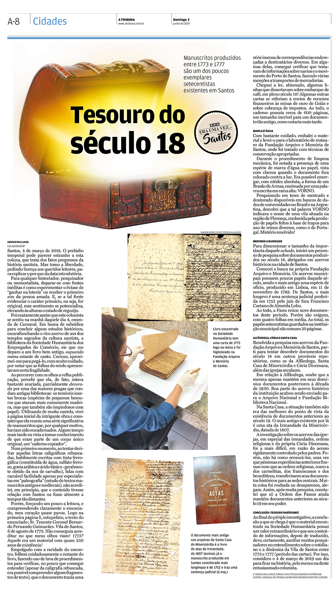 EDIÇÃO DE 2 de junho DE 2019O jornalista Sergio Willians se torna personagem central de uma das maiores descobertas documentais da atualidade, um livro copiador do século 18, que estava esquecido numa prateira da biblioteca da Sociedade Humanitária dos Empregados do Comércio de Santos. O documento, com mais de 600 páginas foi recuperado e encaminhado para o Arquivo Público do Estado de São Paulo. |
