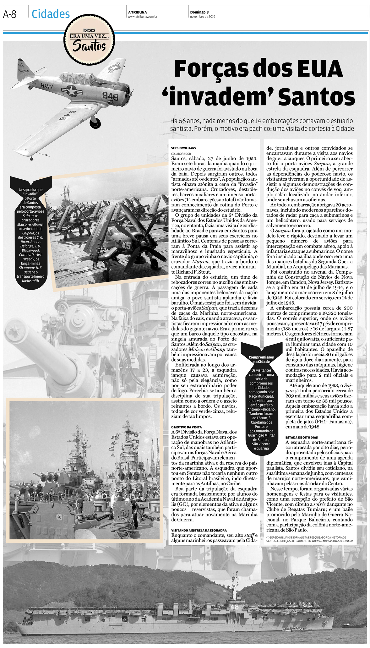 EDIÇÃO DE 03 de novembro DE 2019A visita de uma enorme frota da Marinha de Guerra dos Estados Unidos em 1953 foi o assunto central do artigo do jornalista Sergio Willians, por sua curiosidade. |