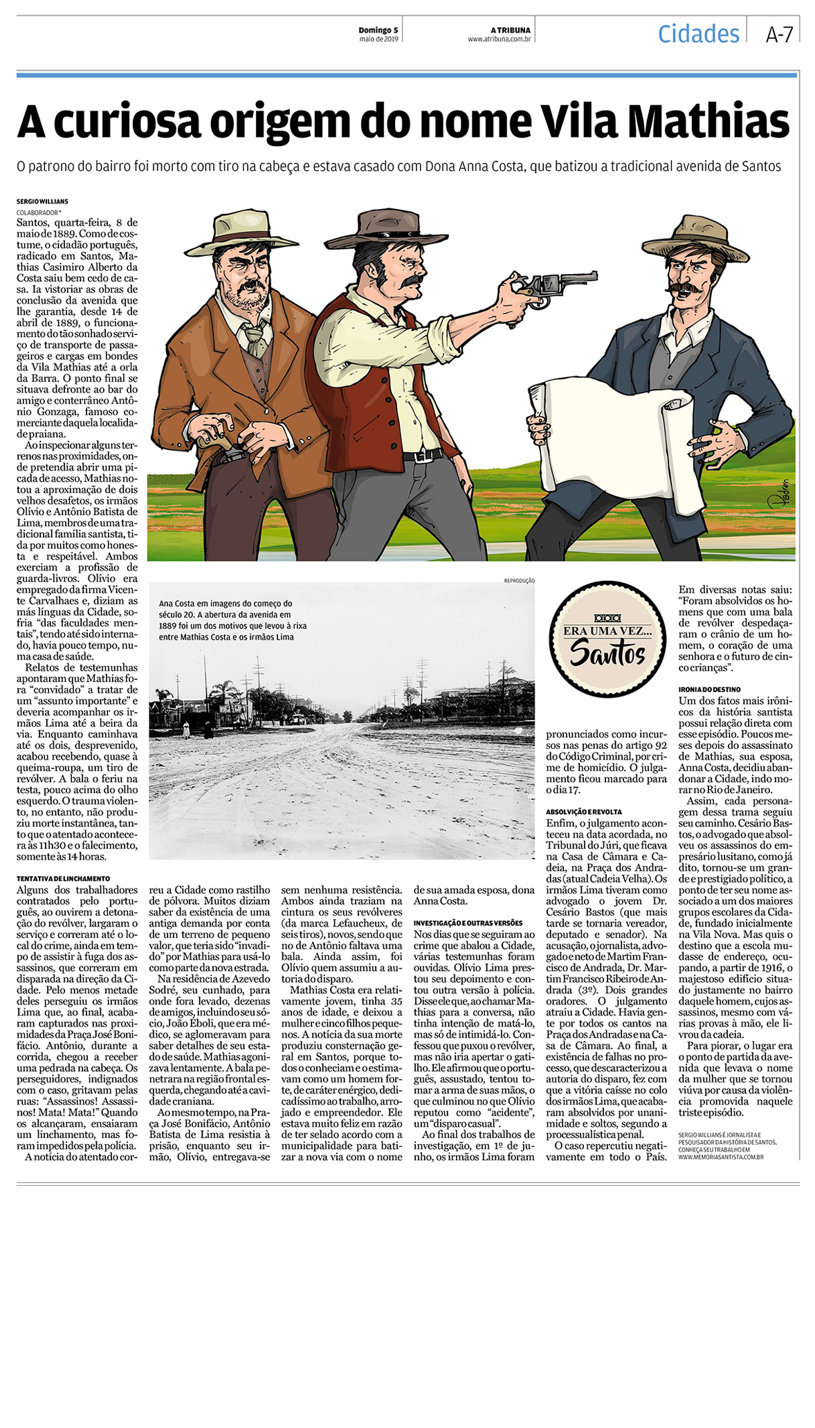 EDIÇÃO DE 05 de maio DE 2019O trágico assassinato do empresário Mathias Casimiro Alberto da Costa, patrono da Vila Mathias, esposo de Dona Anna Costa, em 1889, foi o tema deste emocionante artigo do jornalista Sergio Willians. |