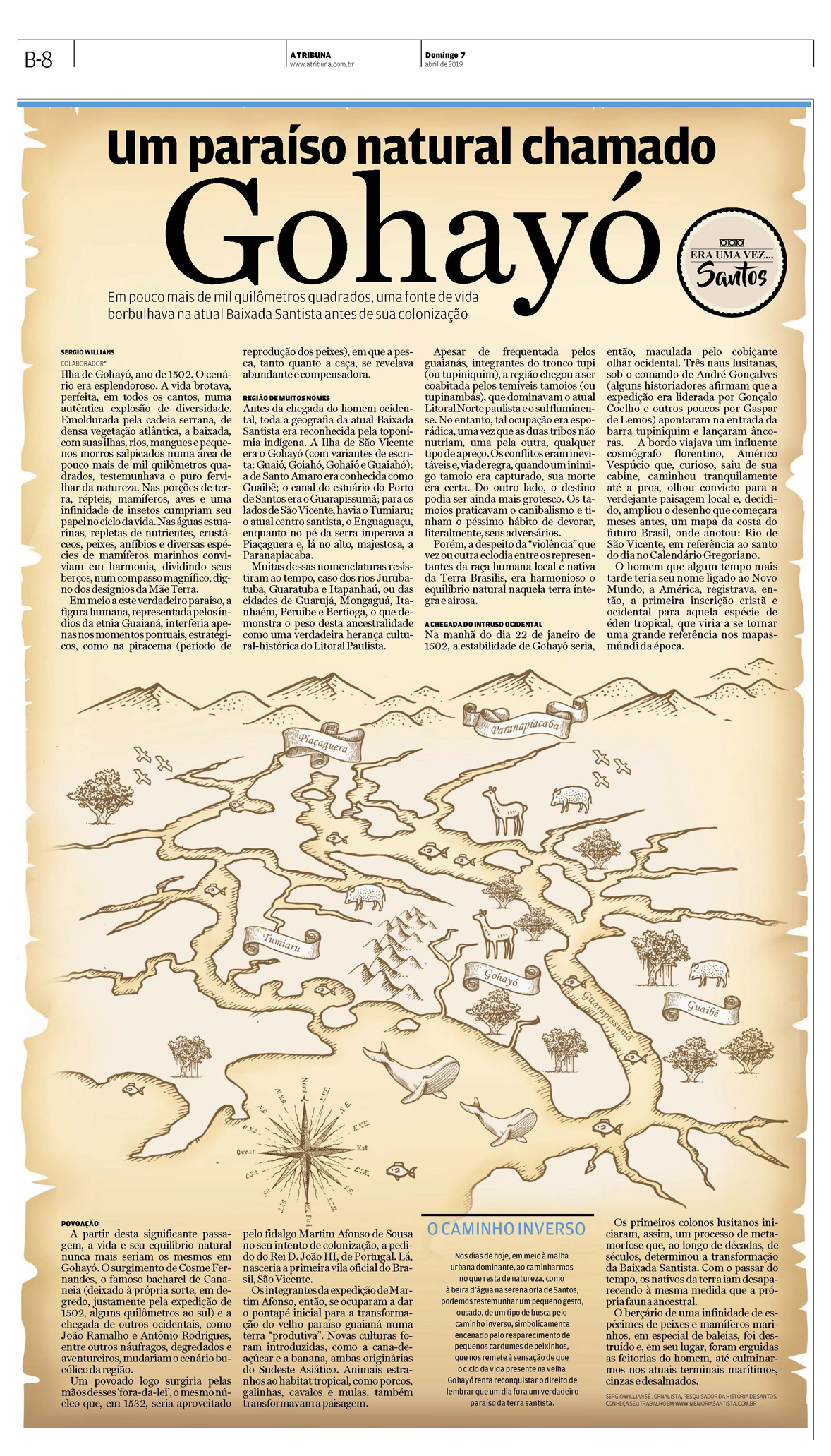 EDIÇÃO DE 7 de abril DE 2019Como deveria ser a Baixada Santista antes da chegada do homem branco, em 1502. Esta é a construção do artigo "Goyahó", nome ancestral da Ilha de São Vicente, que abriga Santos. O jornalista Sergio Willians revela o quanto a natureza era pujante nos idos do passado distante. |