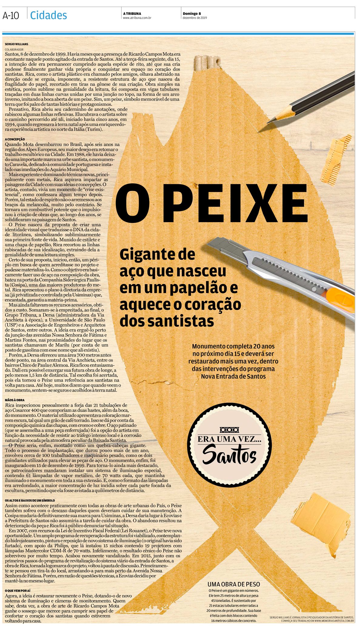EDIÇÃO DE 08 de dezembro DE 2019A famosa escultura do artista plástico Ricardo Campos Mota, o Rica, foi tema do artigo de Sergio Willians para A Tribuna. "O Peixe" nasceu como todas as ideias, do papel, porém desta vez com papelão e recortes criativos. |