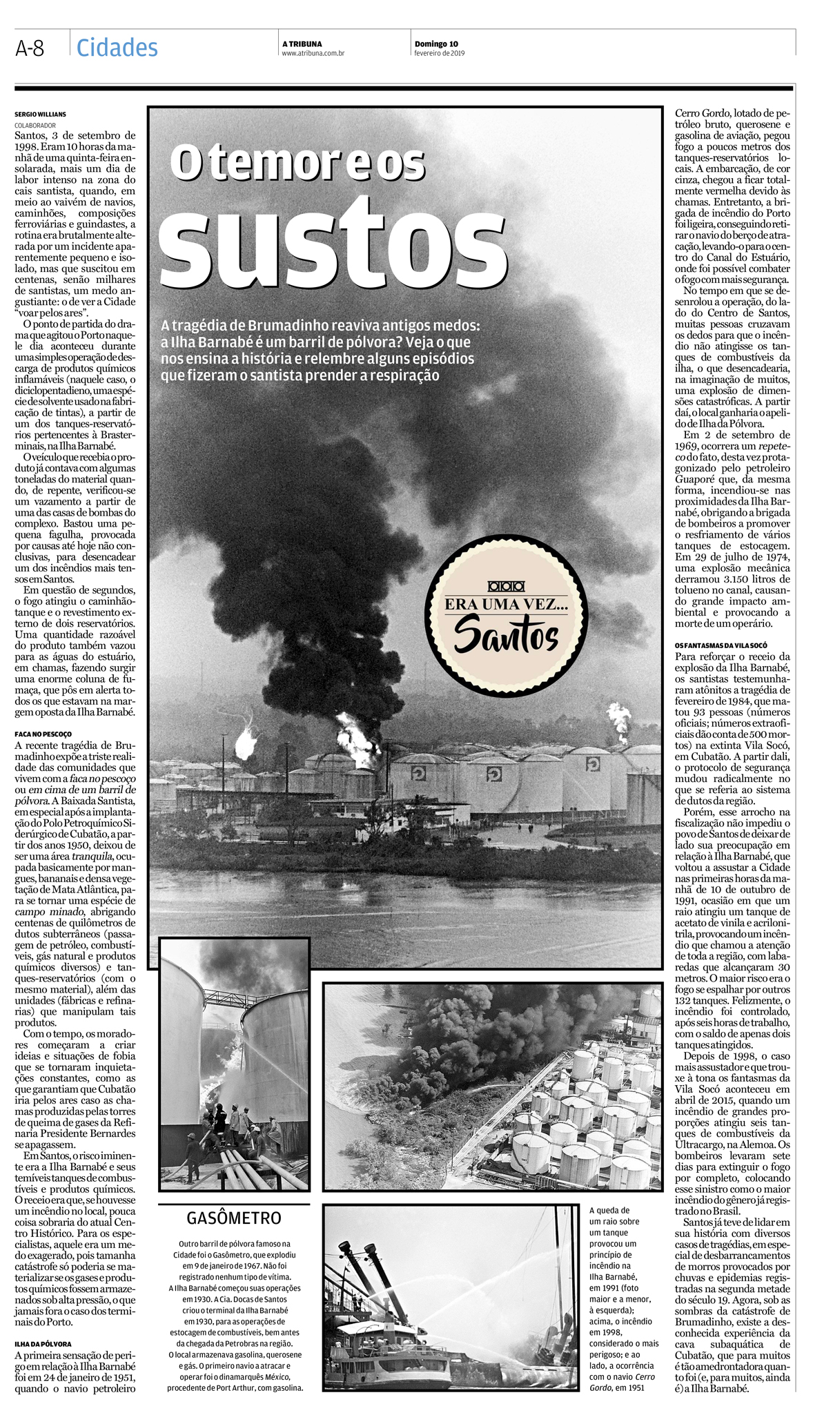 EDIÇÃO DE 10 de fevereIRO DE 2019Por conta da tragédia anunciada de Brumadinho, ocorrida em Minas Gerais em 2019, o jornalista Sergio Willians lembrou os tempos em que Santos também vivia com a "faca no pescoço" em função da explosiva Ilha Barnabé. |