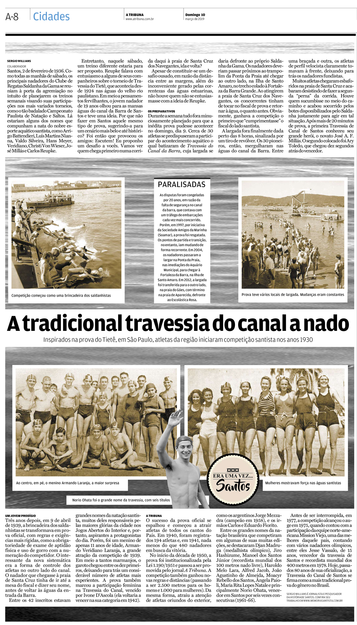 EDIÇÃO DE 10 de março DE 2019Sergio Willians lembrou dos tempos em que a Ponta da Praia vibrava com as provas de natação "Travessia do Canal", existente até os dias de hoje, embora com outro formato. |