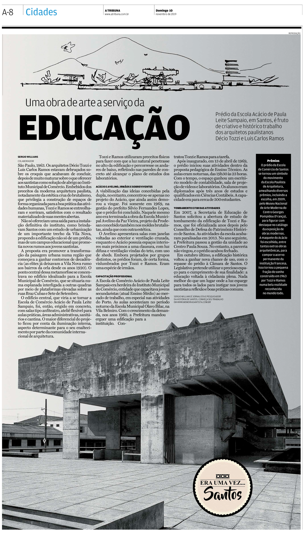 EDIÇÃO DE 10 de novembro DE 2019Uma das edificações brutalistas de maior significância da cidade de Santos, o prédio da Escola de Comércio Acácio de Paula Leite Sampaio, foi tema da coluna do jornalista Sergio Willians. A edificação, premiada em salões internacionais de arquitetura, como em Paris, estavana mídia, por ter sido ocupada pela Câmara Municipal. |