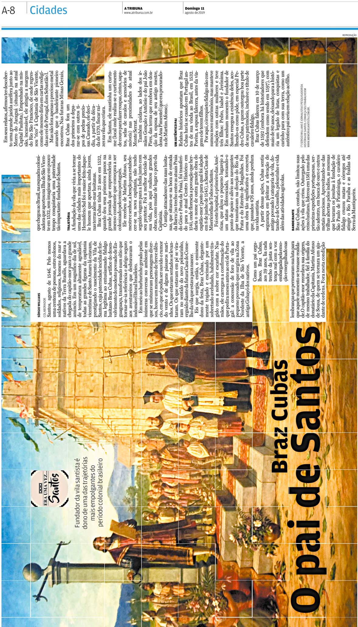 EDIÇÃO DE 11 de AGOSTO DE 2019Como homenagem ao Dia dos Pais, Sergio Willians escreve sobre o fundador de Santos, Braz Cubas, traçando os caminhos deste homem que também foi o primeiro bandeirante brasileiro. |