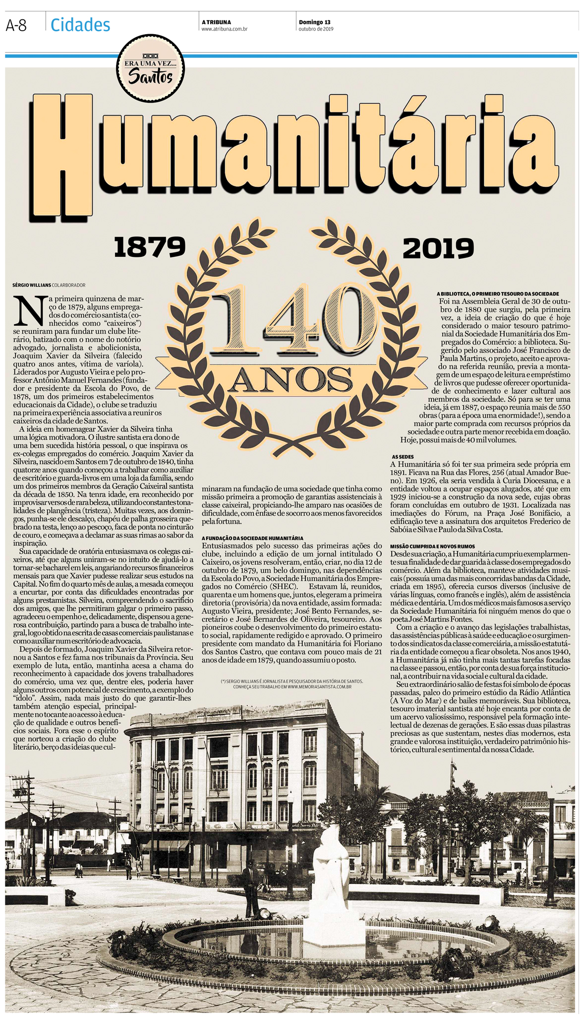 EDIÇÃO DE 13 de outubro dE 2019Uma das instituições mais antigas da cidade, a Sociedade Humanitária dos Empregados do Comércio, completou 140 anos e isso foi rememorado pelo jornalista Sergio Willians, que também é diretor cultural desta importante entidade, dona da biblioteca mais antiga de Santos, criada em 1880. |
