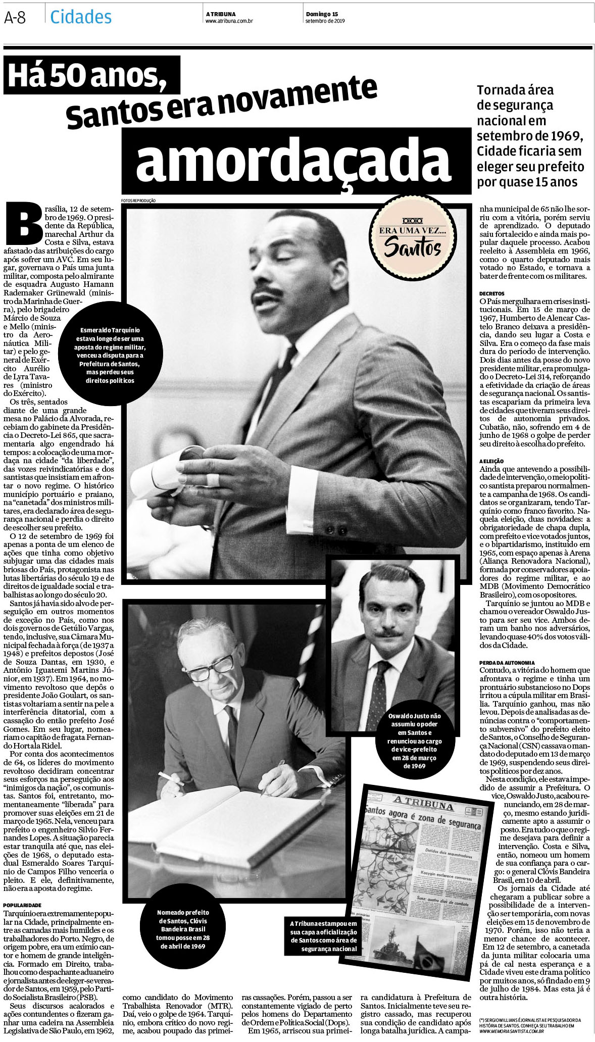 EDIÇÃO DE 15 de setembro DE 2019O jornalista Sergio Willians lembra o dia em que a cidade de Santos foi considerada oficialmente "Área de Segurança Nacional". Neste dia perde o direito de eleger seu prefeito. O texto também aborda a cassação do então prefeito eleito, Esmeraldo Tarquínio Filho, e todo o cenário político que se instalou na cidade. |