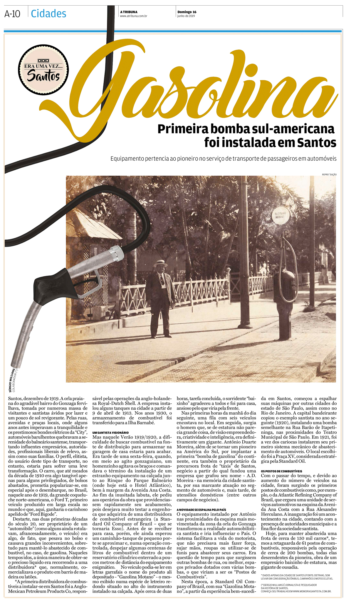 EDIÇÃO DE 16 de junho DE 2019O jornalista Sergio Willians anota o centenário da instalação da primeira bomba de gasolina da América do Sul, colocada na esquina da Ana Costa com a avenida da praia, obra do empresário Antonio Duarte Moreira, em 1919. |
