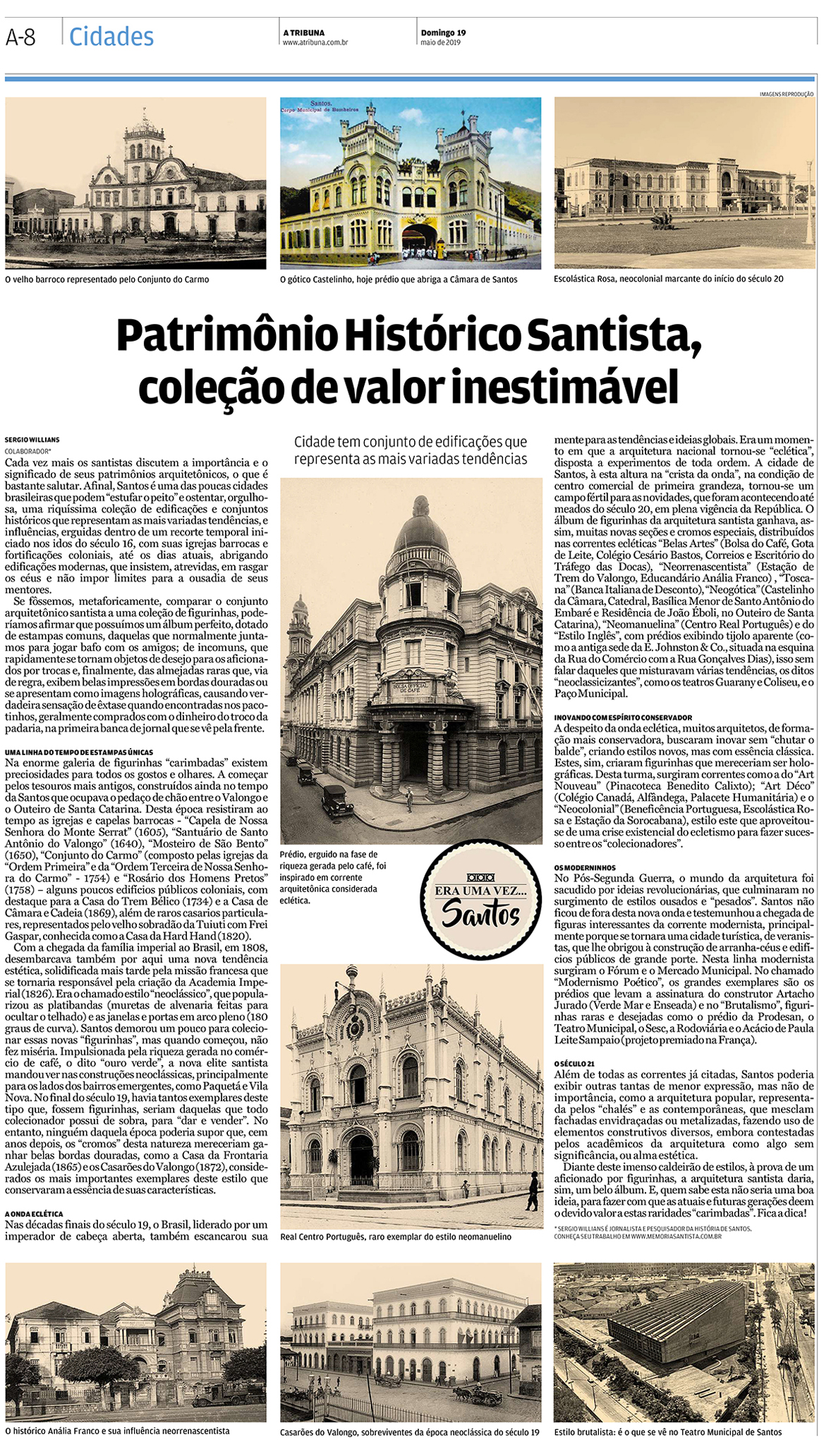 EDIÇÃO DE 19 de maio DE 2019Em meio a questionamentos sobre as resoluções de tombamento na cidade e o valor arquitetônico de Santos, o jornalista Sergio Willians discorre sobre o fato de os santistas serem privilegiados em poder abrigar exemplos de arquitetura das mais variadas correntes e linguagens, recortes temporais que vêm do século 17. |