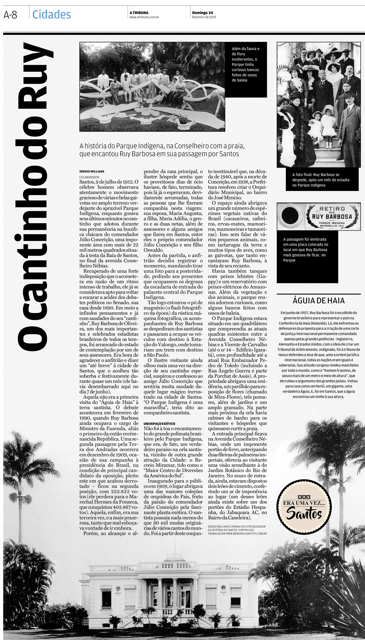 EDIÇÃO DE 24 de fevereiro DE 2019Para comemorar o aniversário do extinto Parque Indígena, de Júlio Conceição, o jornalista Sergio Willians pegou como gancho para a matéria, o fato de o local ser o predileto na cidade ao famoso político baiano, Ruy Barbosa, o "Águia de Haia". |