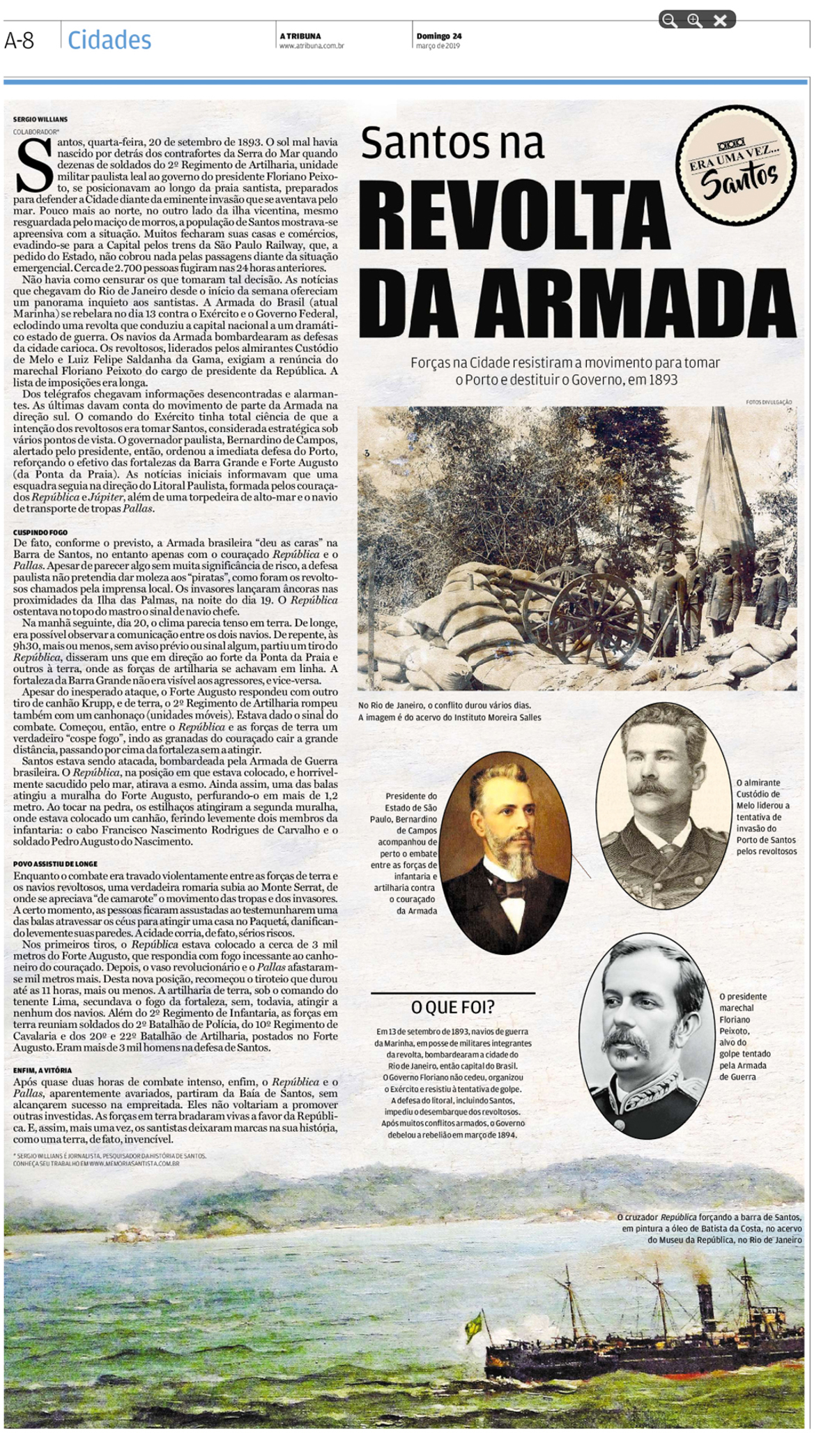 EDIÇÃO DE 24 de março DE 2019As tentativas dos rebeldes da Marinha Brasileira em tomar o porto de Santos foi o tema do artigo do jornalista Sergio Willians, que relembrou alguns episódios da "Revolta da Armada", ocorrido em 1893. |
