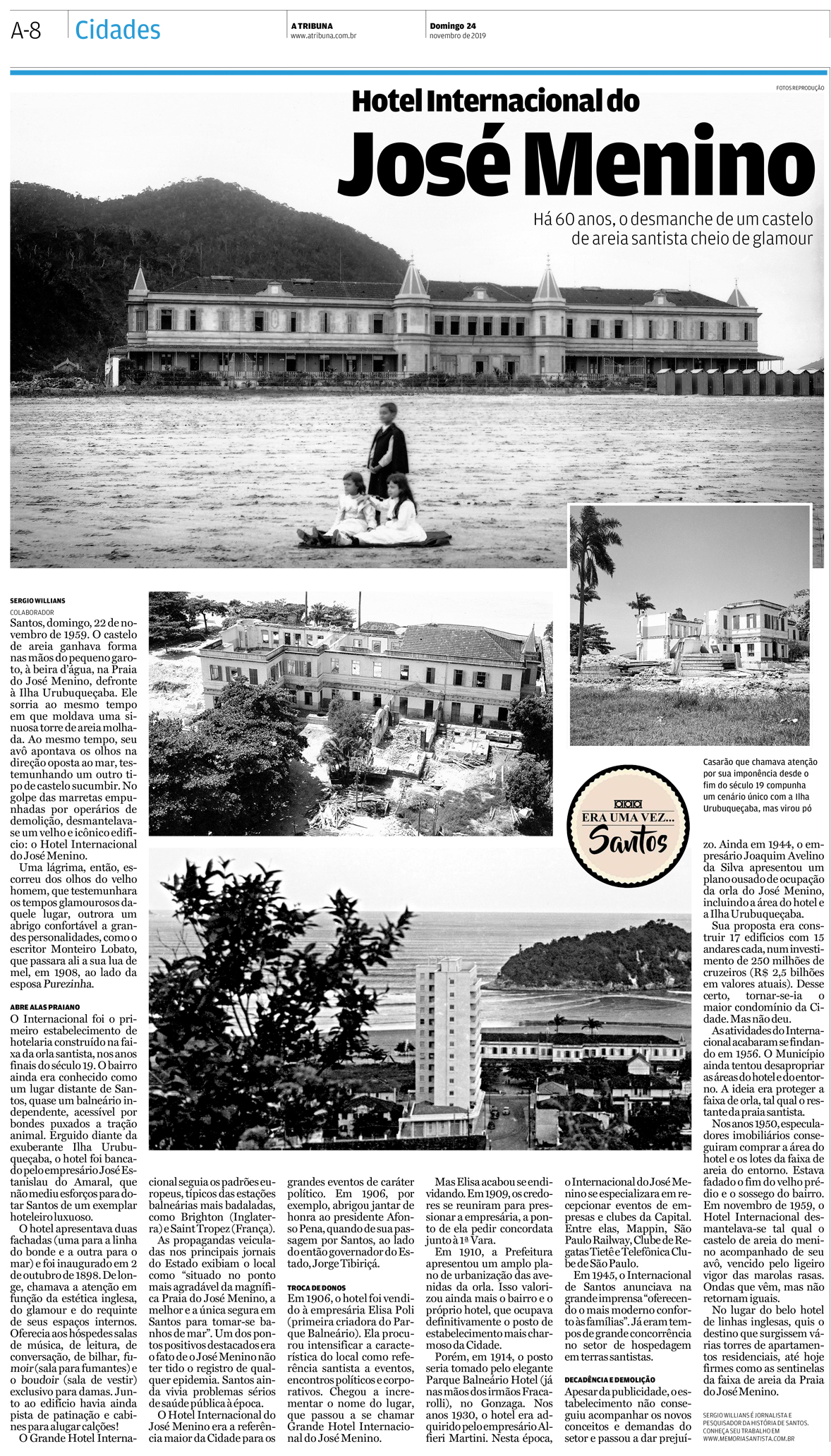 EDIÇÃO DE 24 de novembro DE 2019Poucos santistas conheciam a história do famoso Hotel Internacional do José Menino, o mais antigo a se instalar na zona de praia de Santos. |