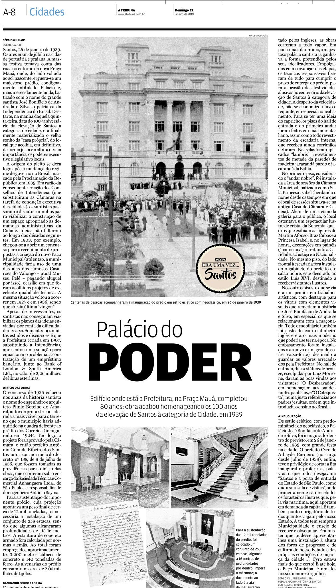 EDIÇÃO DE 27 DE JANEIRO DE 2019Um dos maiores ícones arquitetônicos da cidade, o Palácio José Bonifácio de Andrada e Silva, o Paço Municipal, competou 80 anos e foi homenageado neste incrível artigo de Sergio Willians. |