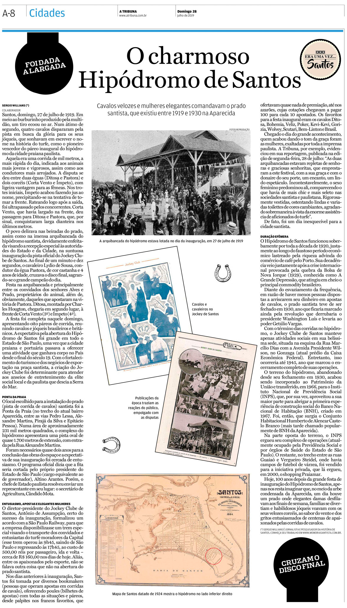 EDIÇÃO DE 28 de julho DE 2019Fato que pouquíssimos santistas conheciam, o jornalista Sergio Willians falou sobre a existência do Hipódromo de Santos, que situava-se onde hoje se encontram o Conjunto Habitacional Castelo Branco (BNH Aparecida) e o Shopping Praiamar. O local fora inaugurado em julho de 1919, ou seja, há 100 anos. |