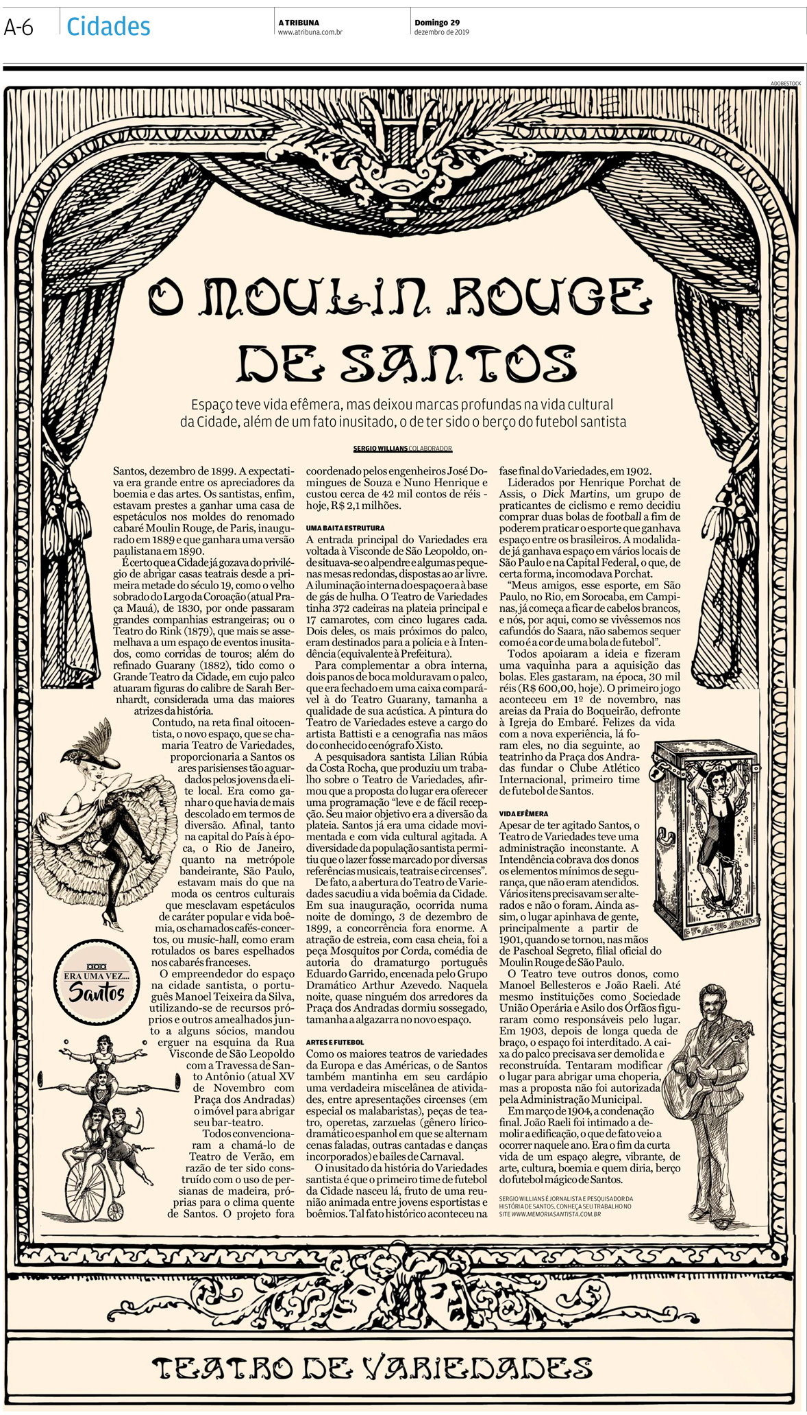 EDIÇÃO DE 29 de dezembro DE 2019O último artigo de 2019 trouxe a história do Teatro de Variedades, o Molin Rouge de Santos. Neste emblemático espaço nasceu o futebol na cidade de Santos, com a fundação do Internacional. |