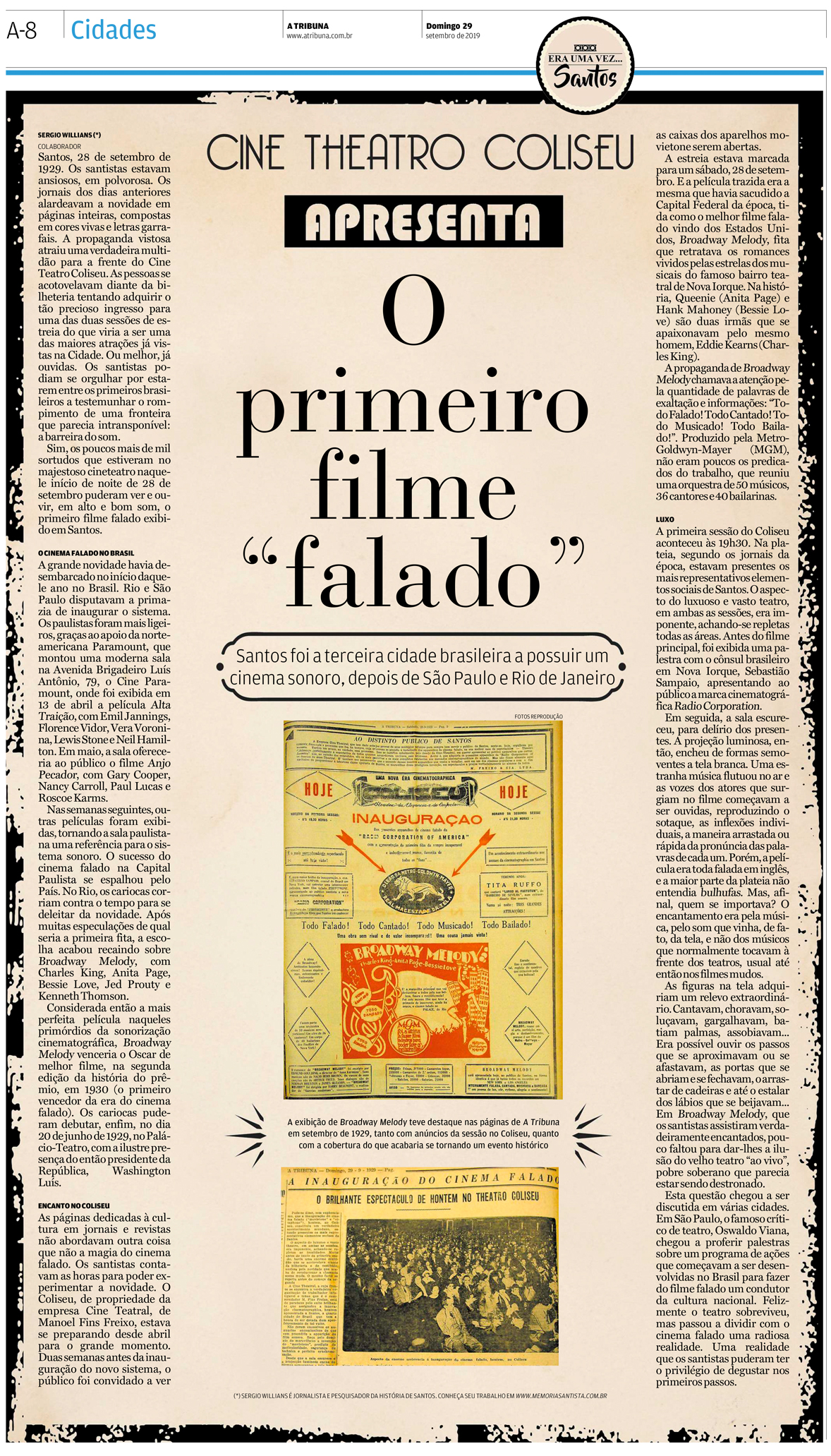 EDIÇÃO de 29 de setembro DE 2019A primeira vez que um filme com som foi exibido na cidade de Santos foi o tema deste artigo, que lembrou os 90 anos do fato. Santos foi a terceira cidade brasileira a contar com cinemas com sistema sonoro. |