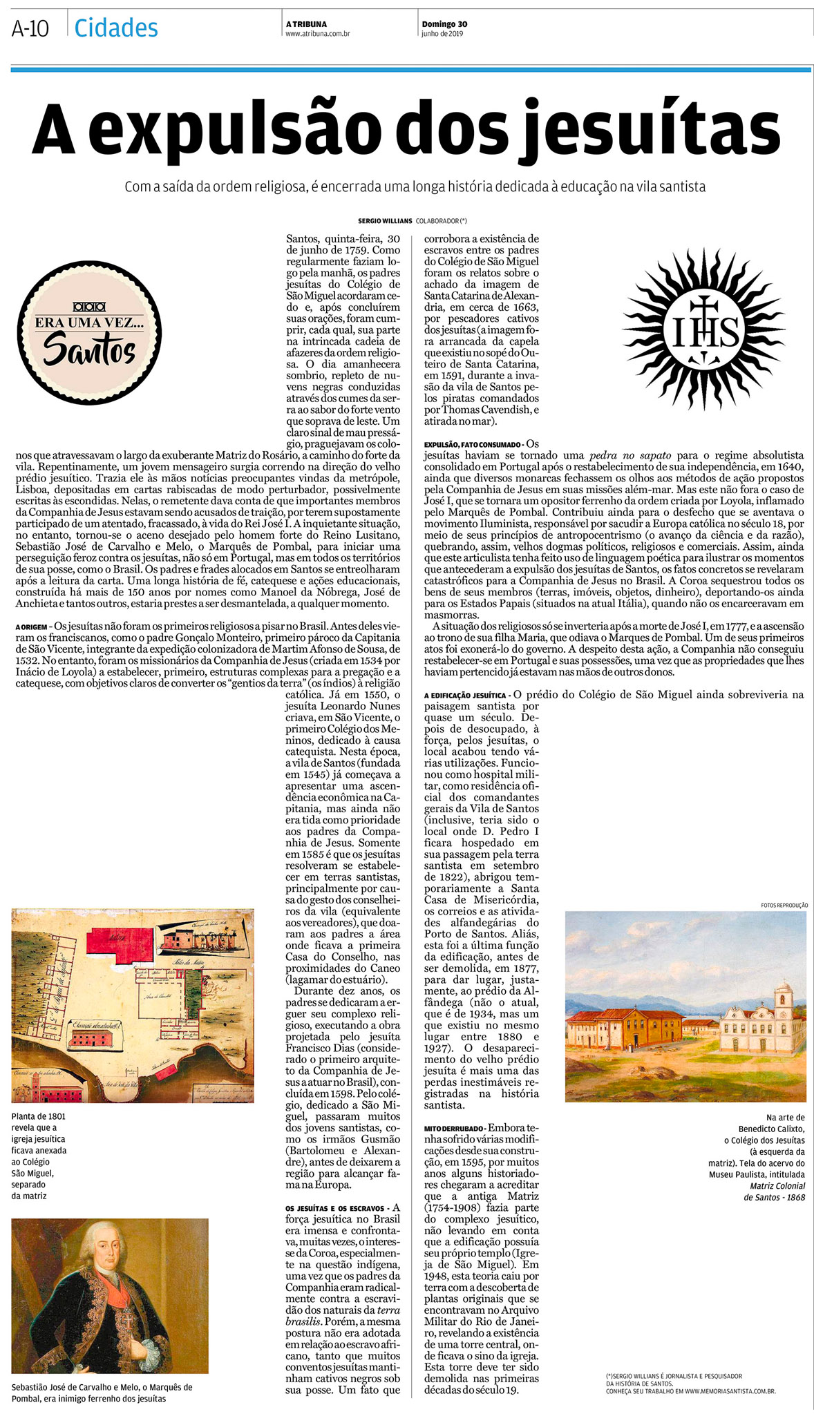 EDIÇÃO DE 30 de junho DE 2019O jornalista Sergio Willians produz artigo sobre a participação dos Jesuítas na vida santista durante o período colonial, pegando como gancho o ato real de expulsão desta ordem religiosa nas terras brasileiras, em 1759. |