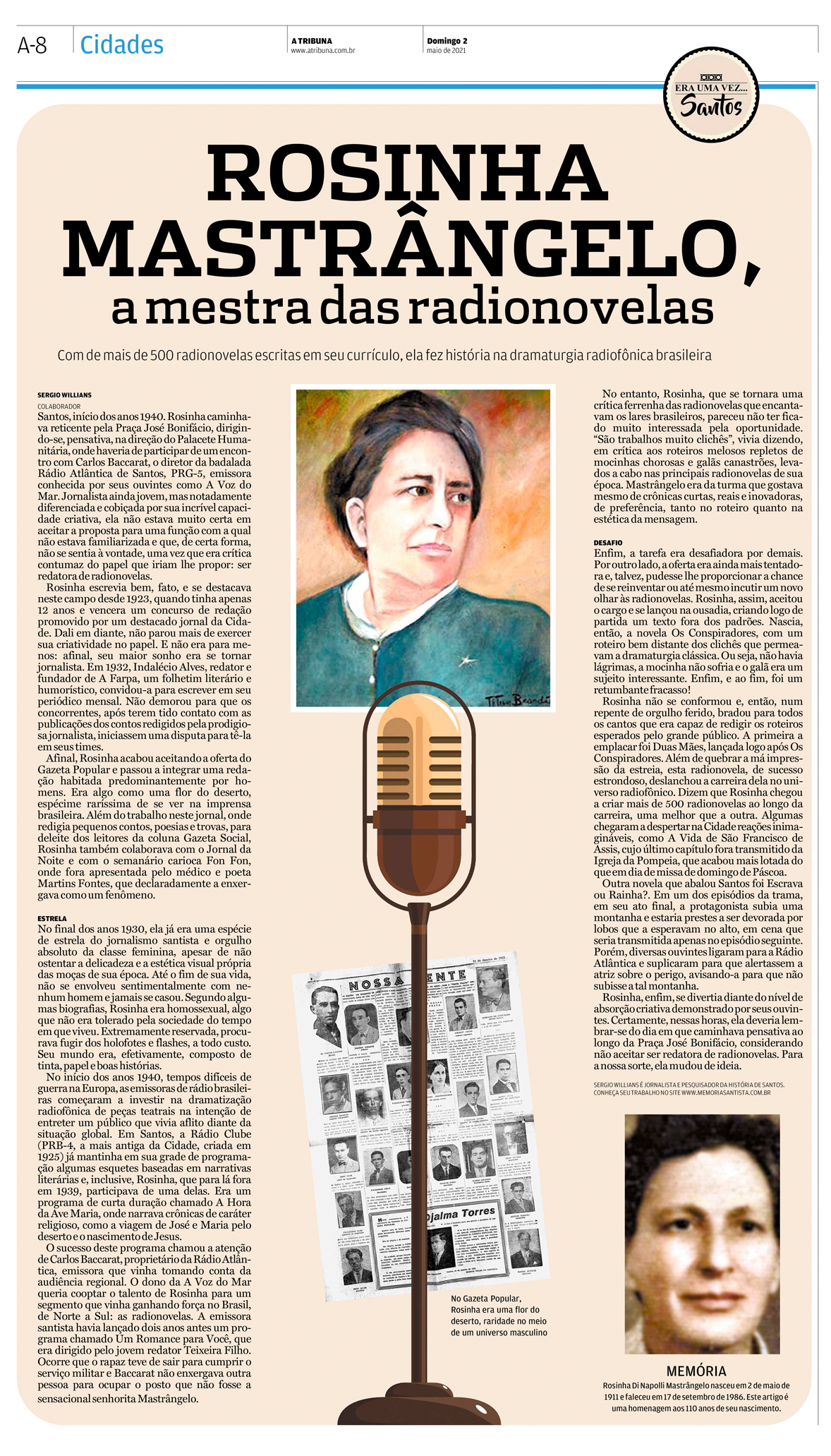 EDIÇÃO DE 02 de MAIO de 2021Comemorando os 110 anos do nascimento da famosa escritora Rosinha Mastrângelo, o jronalista Sergio Willians traz ao leitor o seu lado mais importante, como redatora de radionovelas. |