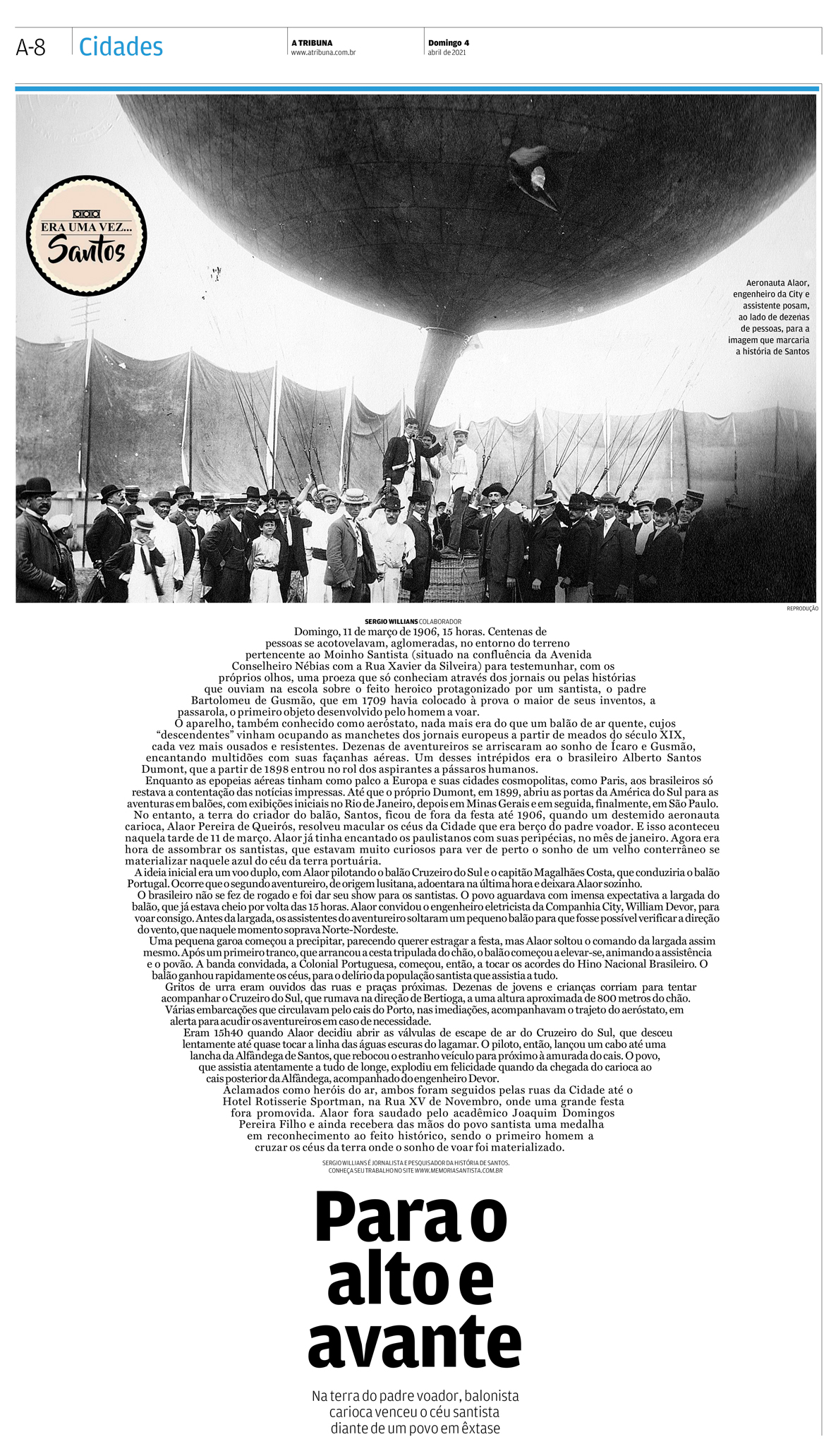 EDIÇÃO DE 04 de ABRIL de 2021A aventura do jornalista carioca Alaor Pereira de Queiroz pelos céus da cidade onde nasceu o precursor da navegabilidade aérea, Bartolomeu de Gusmão, foi destaque em A Tribuna. |