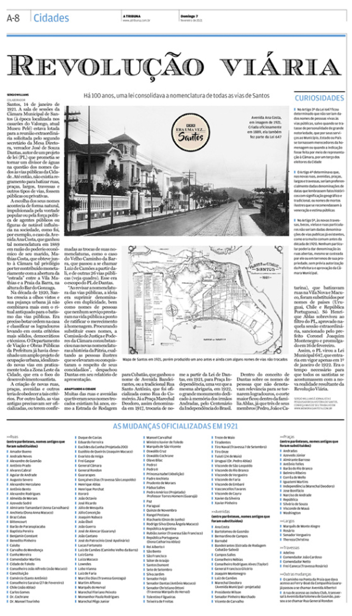 EDIÇÃO DE 07 de FEVEREIRO DE 2021O jornalista Sergio Willians discorre sobre a maior transformação viária da história de Santos, que normatizou em Lei Municipal, todas as ruas, avenidas, praças, largos, etc. |