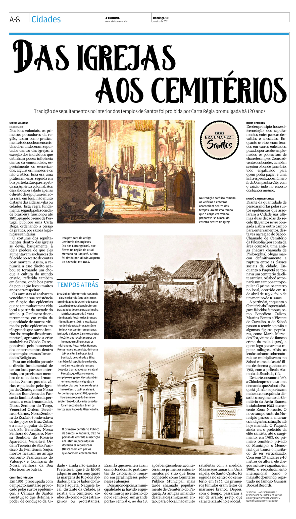 EDIÇÃO DE 10 DE JANEIRO DE 2021O jornalista Sergio Willians aborda neste artigo como eram os sepultamentos dos moradores da vila de Santos até o surgimento dos primeiros cemitérios da cidade. |