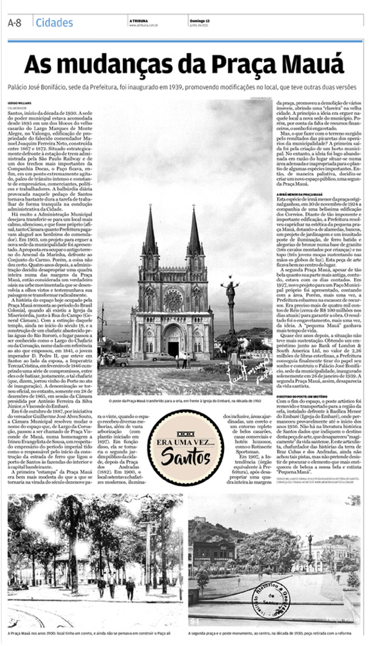 EDIÇÃO DE 13 de JUNHO de 2021O jornalista Sergio Willians escreve sobre uma "segunda" Praça Mauá, que existiu no local onde hoje está erguido o Paço Municipal e destaca como curiosidade o poste de ferro batido artístico, uma obra de arte que desapareceu da vida da cidade. |
