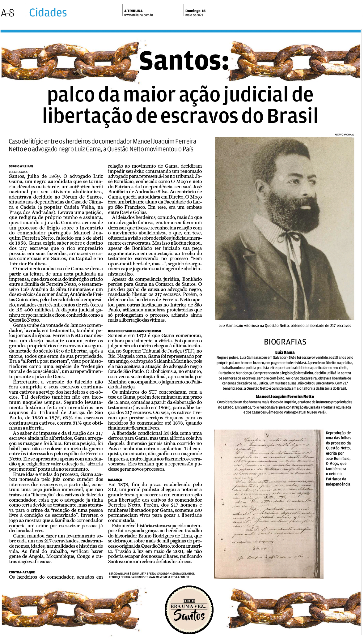 EDIÇÃO DE 16 de MAIO de 2021A partir de um estudo acadêmico sobre um importante processo de inventário, o jornalista Sergio Willians escreve sobre um dos casos mais famosos do notório advogado abolicionista Luiz Gama, que teve como palco a Comarca de Santos. Foi o maior processo de libertação de escravos da história do Brasil. |