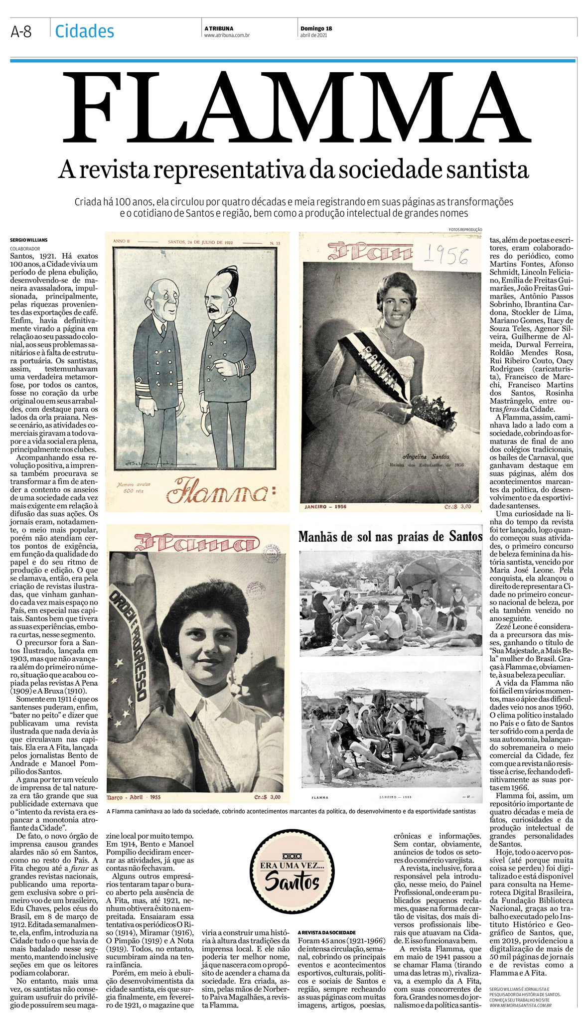 EDIÇÃO DE 18 de ABRIL de 2021Sergio Willians narra neste artigo a trajetória de uma das revistas mais importantes da história de Santos, a "Flamma", responsável pela cobertura mais rebuscada dos fatos da cidade entre os anos 1920 e 1950. |