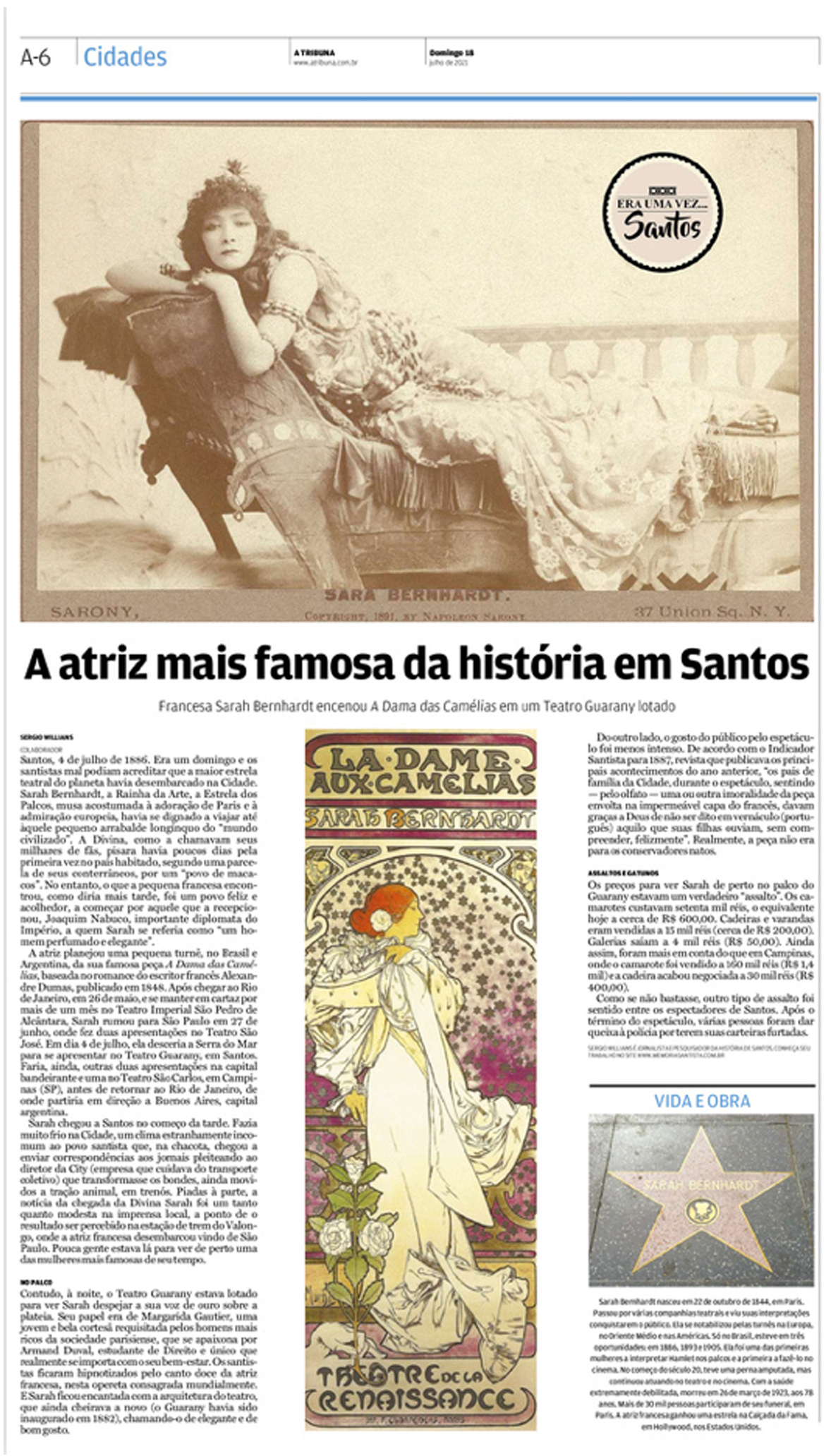 EDIÇÃO DE 18 de JULHO de 2021A passagem da mais famosa atriz de teatro do mundo no Século 19, a francesa Sarah Bernhardt, pela cidade de Santos, onde apresentou a "Dama das Camélias", no Teatro Guarany, foi tema da coluna. |