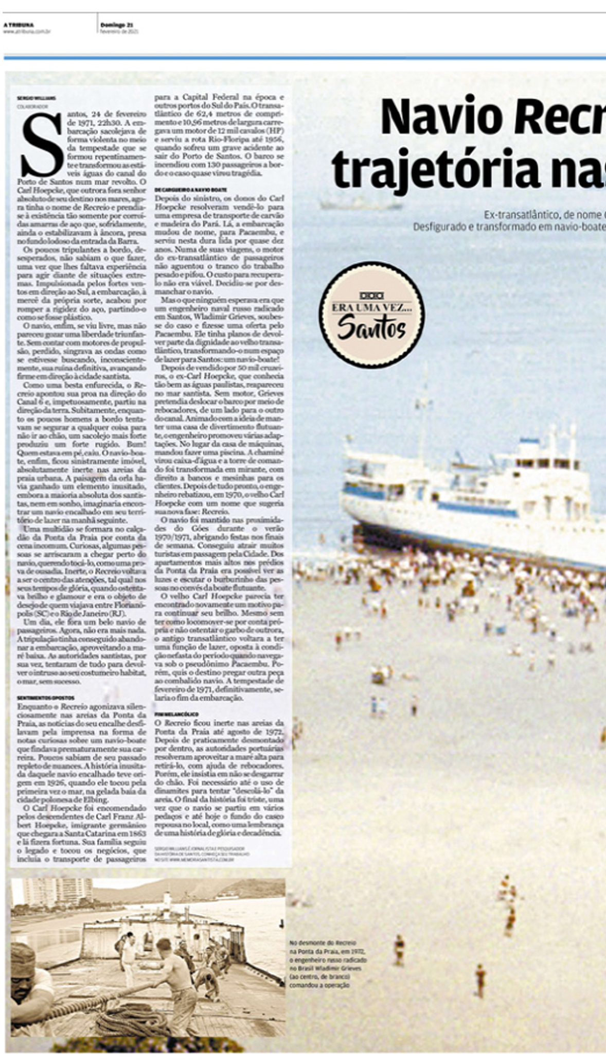 EDIÇÃO DE 21 de FEVEREIRO DE 2021Matéria de página dupla sobre os 50 anos do acidente do navio Recreio, na Ponta da Praia. |