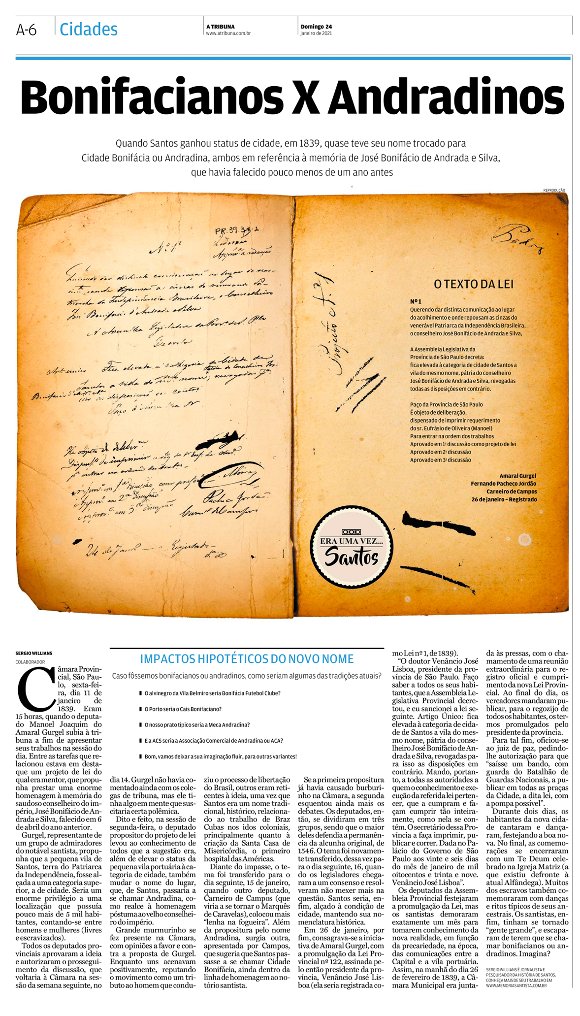 EDIÇÃO DE 24 DE JANEIRO DE 2021Neste artigo, o jornalista Sergio Willians discorre sobre a elevação de Santos à categoria de cidade, ocorrido em 1839. Na época houve uma longa discussão sobre a mudança do nome, para Bonifácia ou Andradina. Mas Santos acabou sendo mantido, para sorte dos santistas. |
