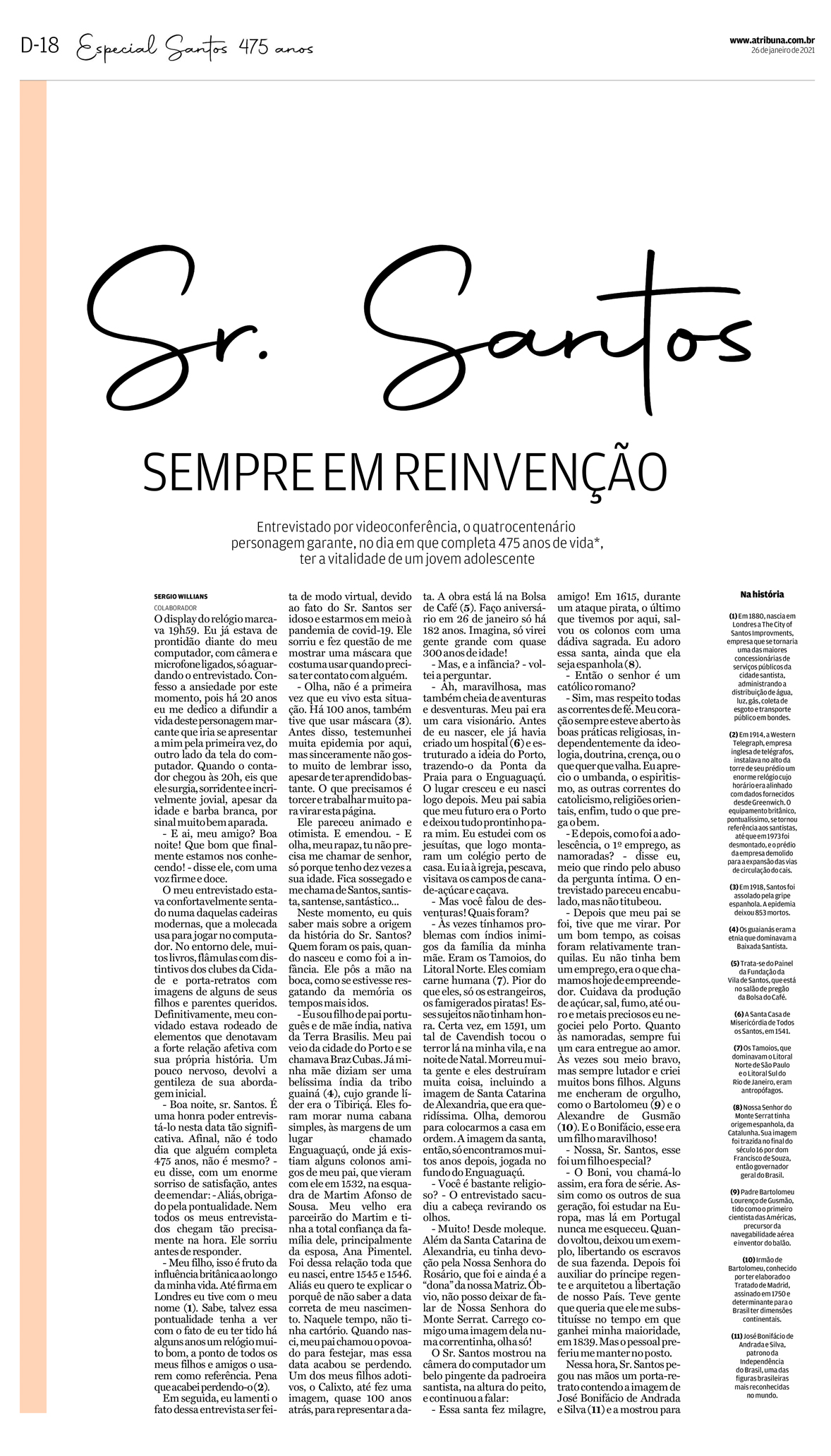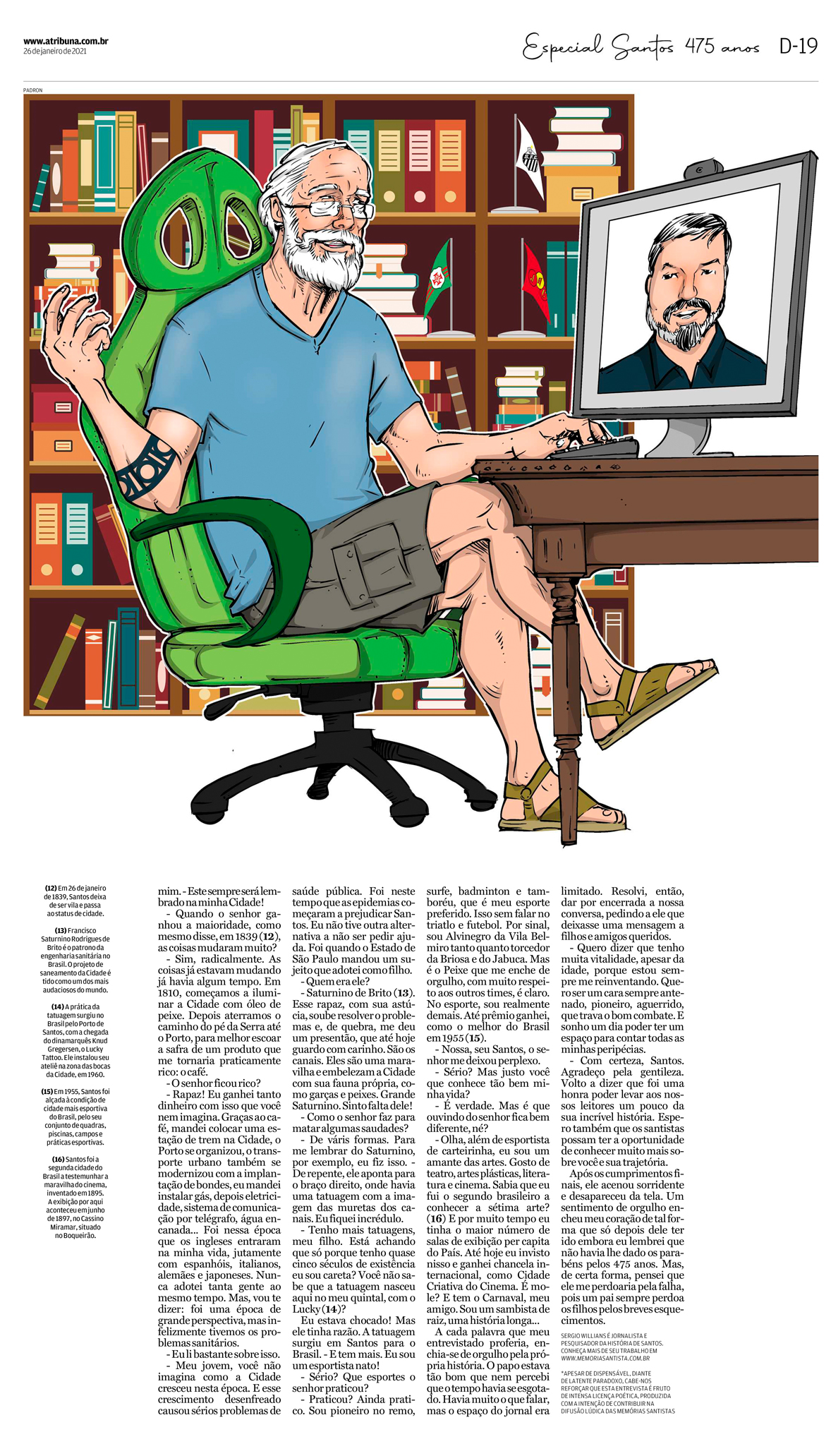 EDIÇÃO ESPECIAL DE 26 DE JANEIRO DE 2021Artigo especial de duas páginas, onde o jornalista Sergio Willians promove uma "entrevista" com a personificação da cidade de Santos. Página dupla. Segue abaico a outra página. |