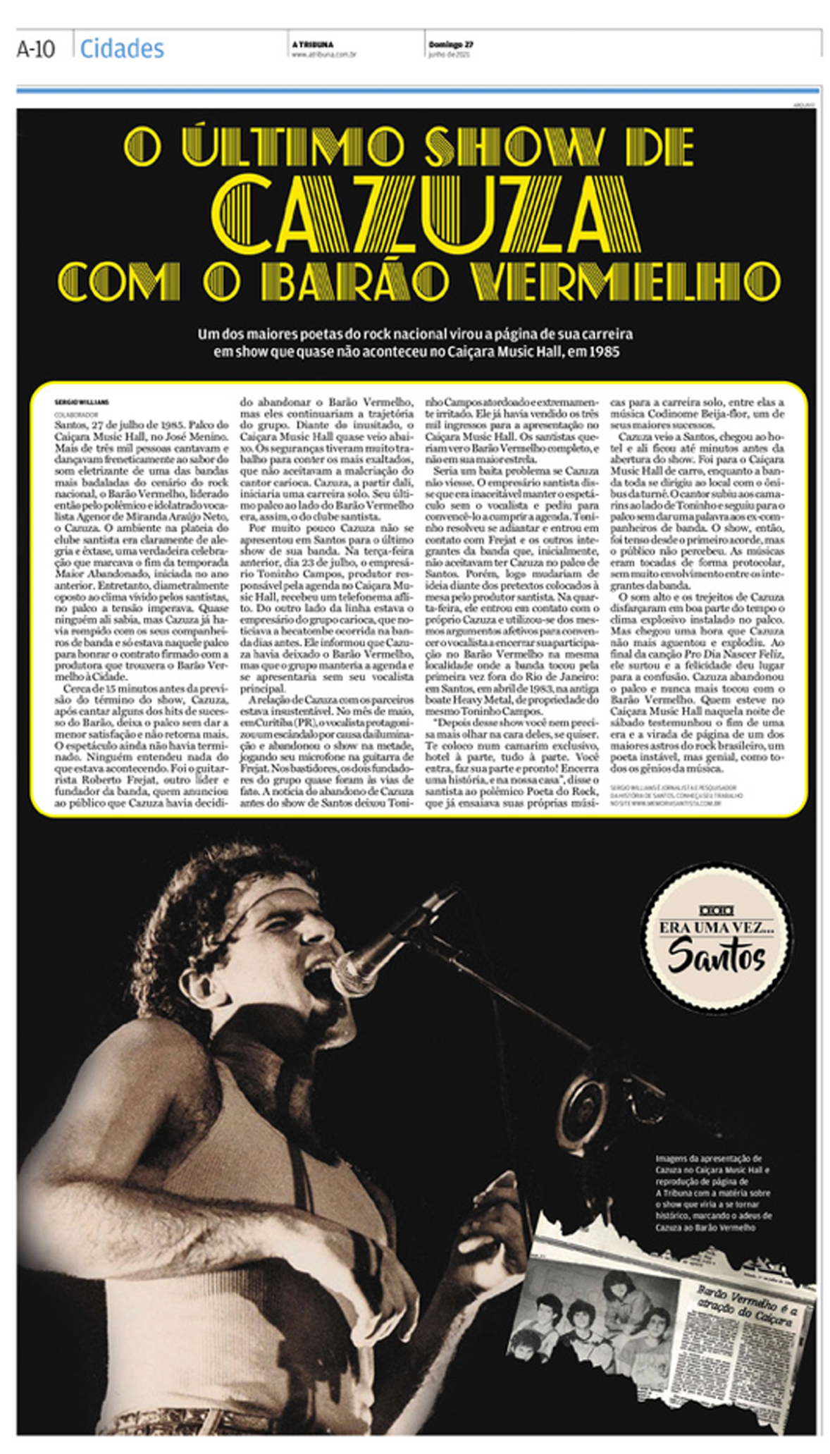 EDIÇÃO DE 27 de JUNHO de 2021Sergio Willians lembrou os 36 anos do último show do poeta do rock brasileiro, Cazuza, junto à sua banda, o Barão Vermelho, que aconteceu em Santos no ano de 1985, no Caiçara Musiv Hall. Esta matéria trouxe fotos inéditas daquele espetáculo. |