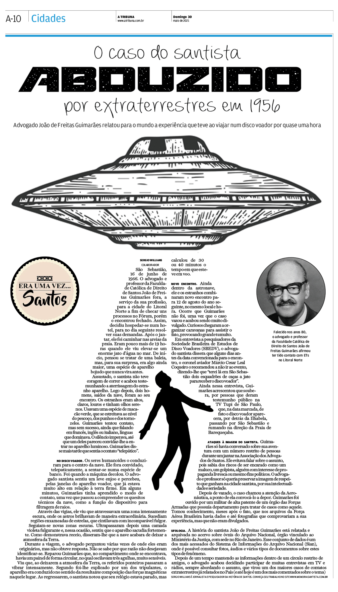 EDIÇÃO DE 30 de MAIO de 2021Sergio Willians narra o inusitado relato do respeitadíssimo advogado e professor de Direito, João de Freitas Guimarães, que alegou ter sido anduzido por extraterrestres em 1956. O caso até os dias de hoje é considerado um dos mais importantes do país para ufólogos. |