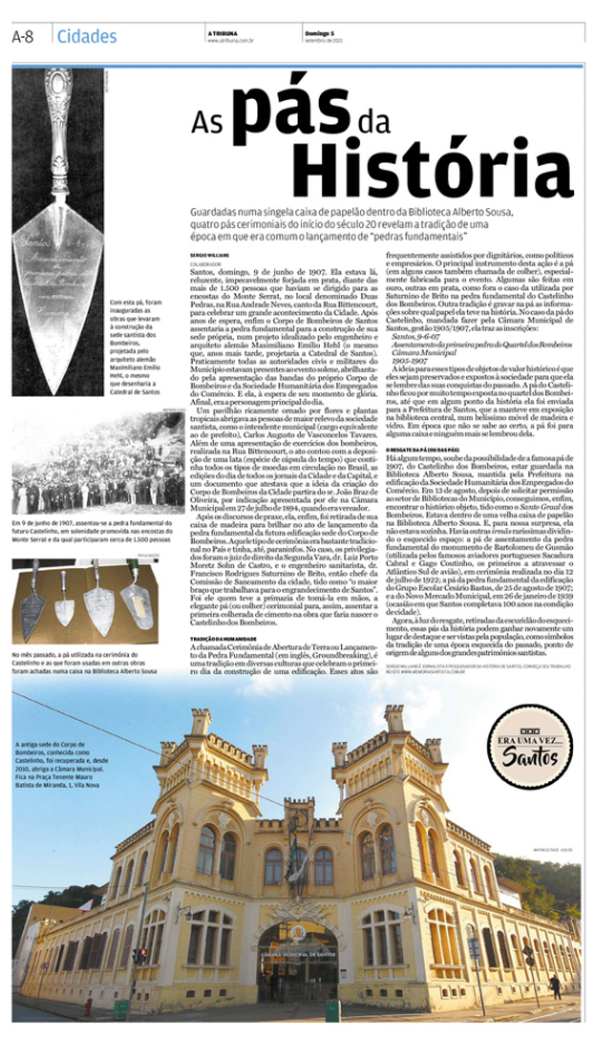 EDIÇÃO DE 05 de SETEMBRO de 2021Sergio Willians escreve sobre alguns dos objetos mais raros e importantes da história da cidade, as pás cerimoniais que foram utilizadas para o assentamento de pedras fundamentais de espaços icônicos, como o Castelinho dos Bombeiros, o monumento de Bartolomeu de Gusmão, o Colégio Cesário Bastos e o Mercado Municipal. |